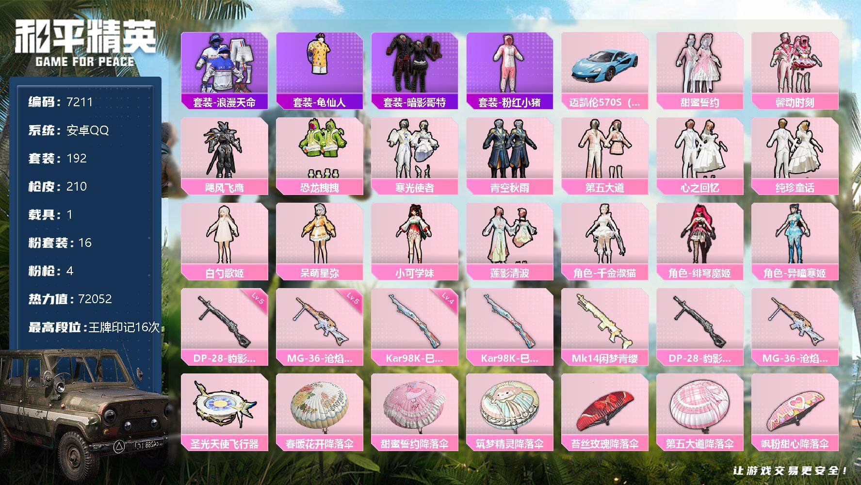 【商品标题】:安卓 手Q-4粉装-4特效枪-0载具-18426热力值-2印记-