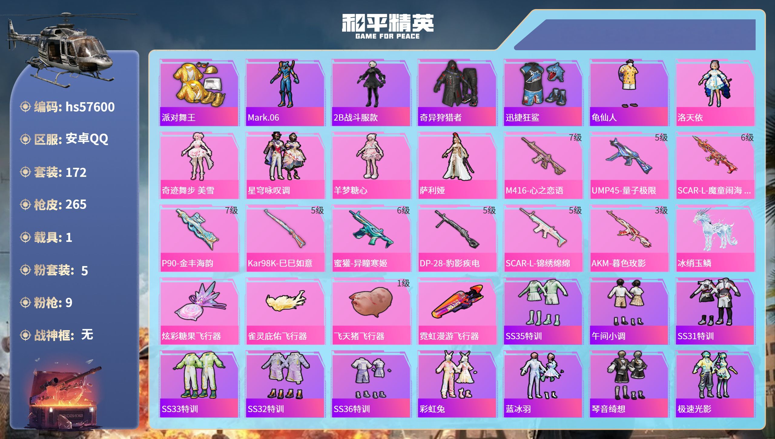 hs57600 安卓手Q-18王牌印记-5粉装-9特效枪-1载具-80781热力值-172套装-26
