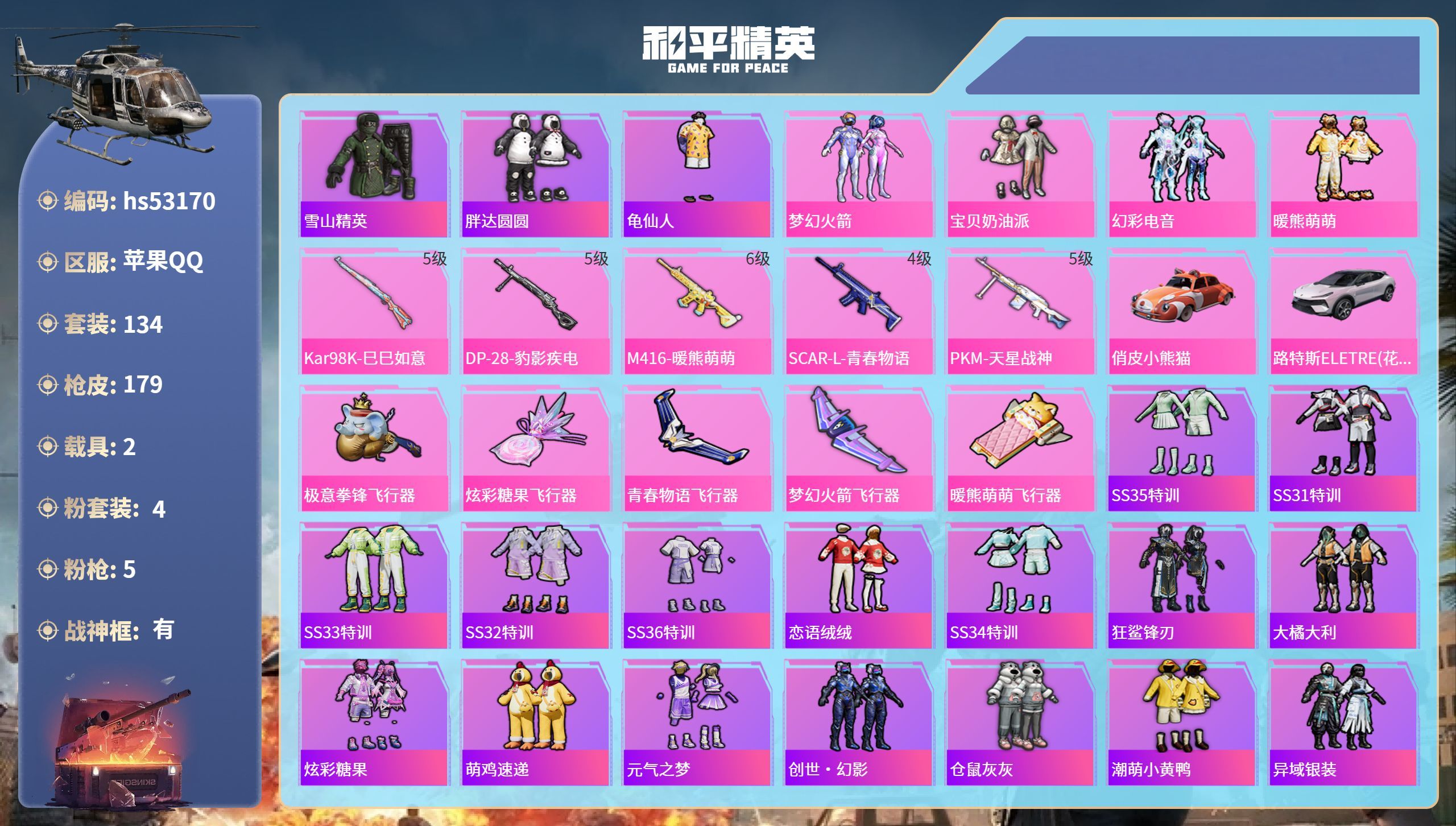 hs53170 苹果手Q-14王牌印记-有战神框-4粉装-5特效枪-2载具-62175热力值-134
