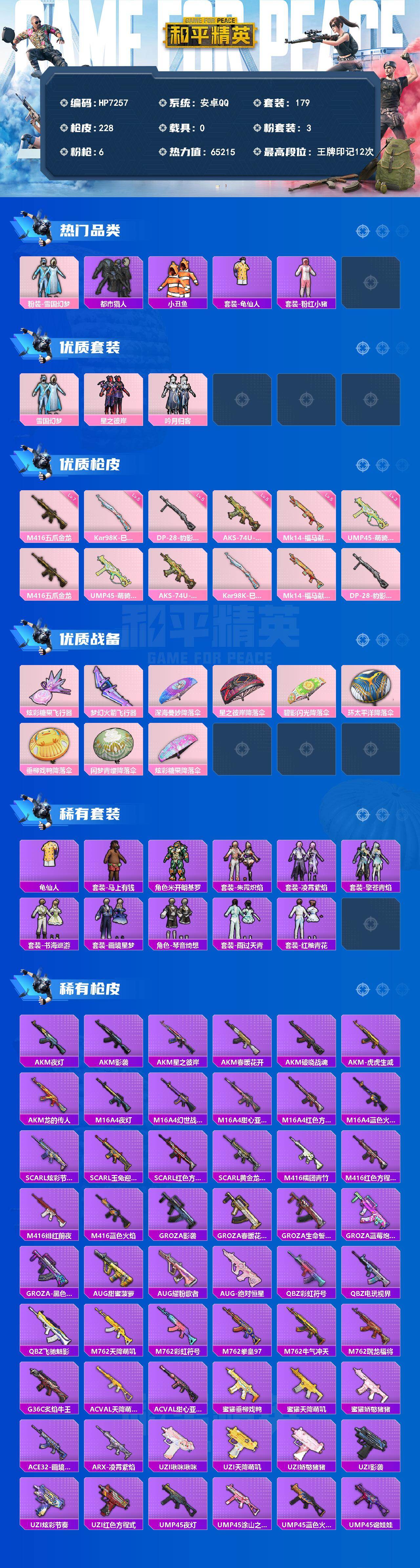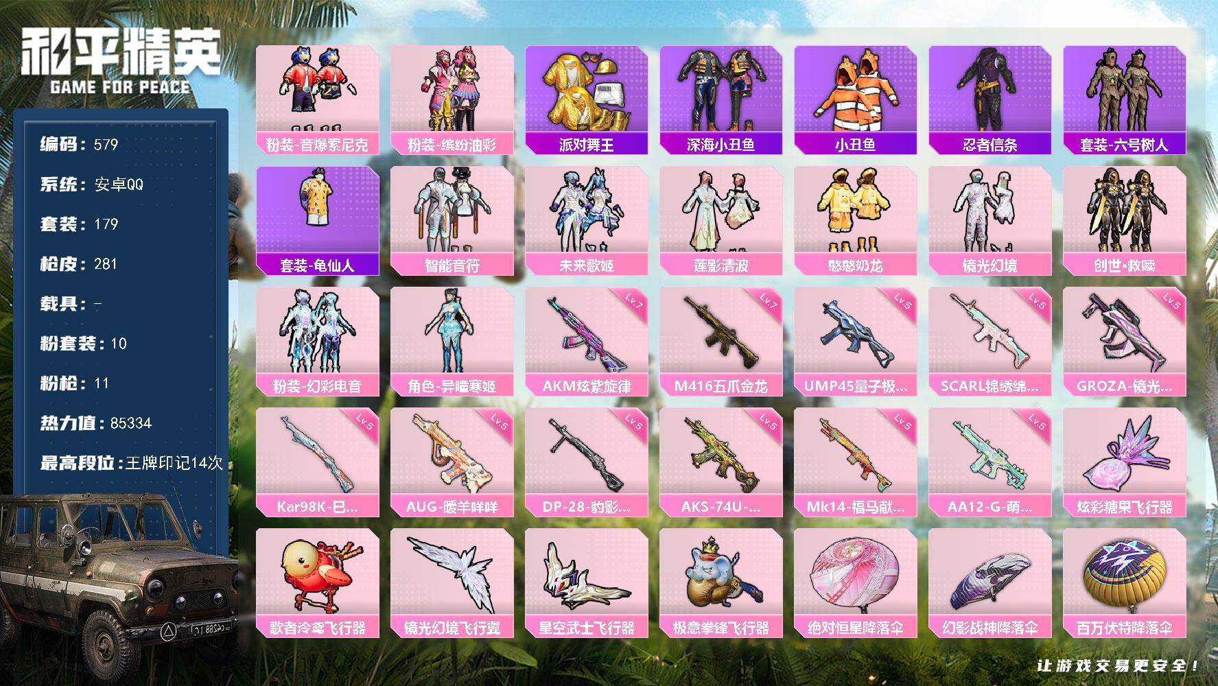 安卓 手Q-9粉装-7特效枪-1载具-1粉色飞行器-61594热力值-10王牌