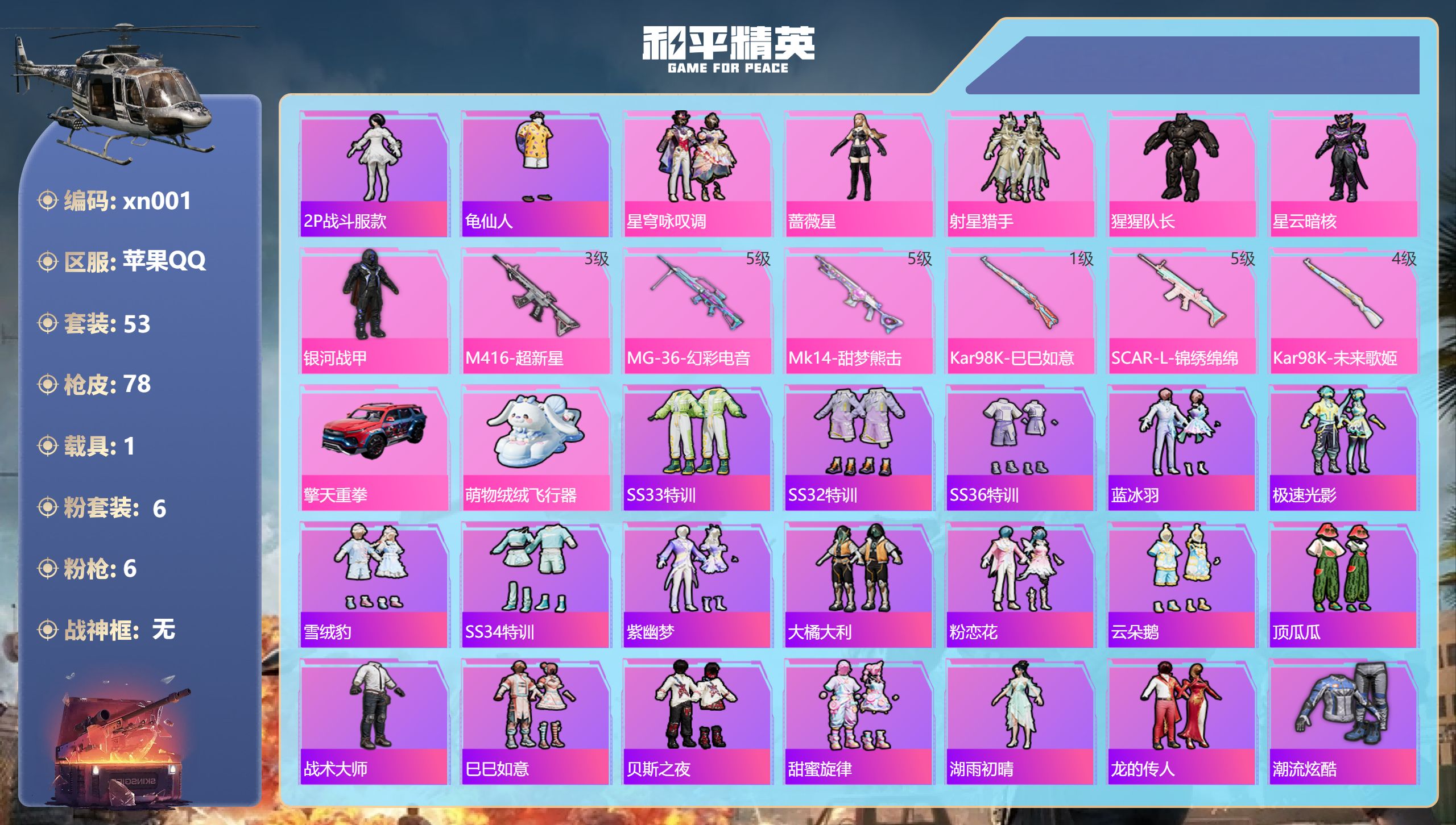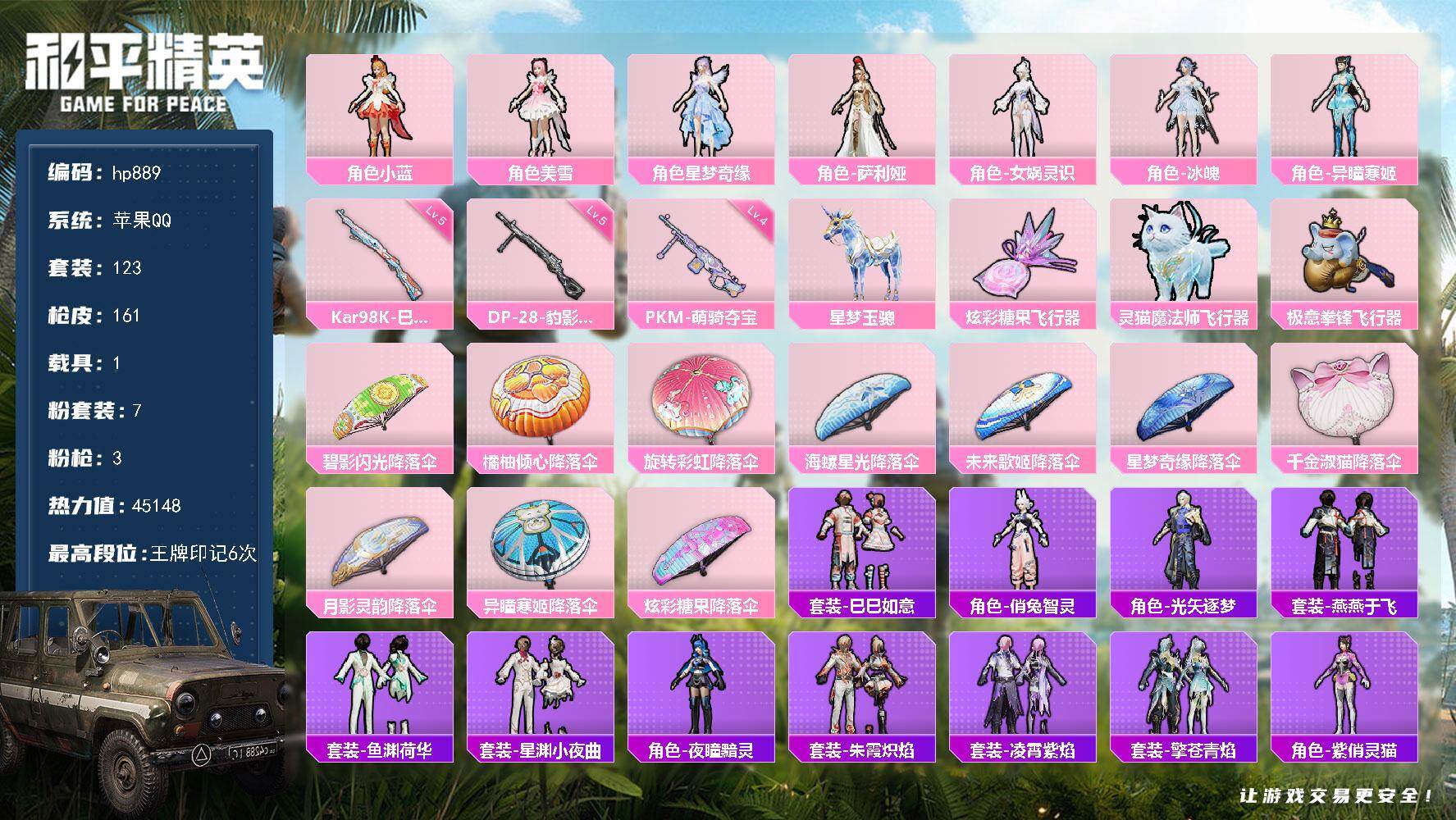 7粉装-3特效枪-1载具-3粉色飞行器-45148热力值-6王牌印记-123套装-161枪皮