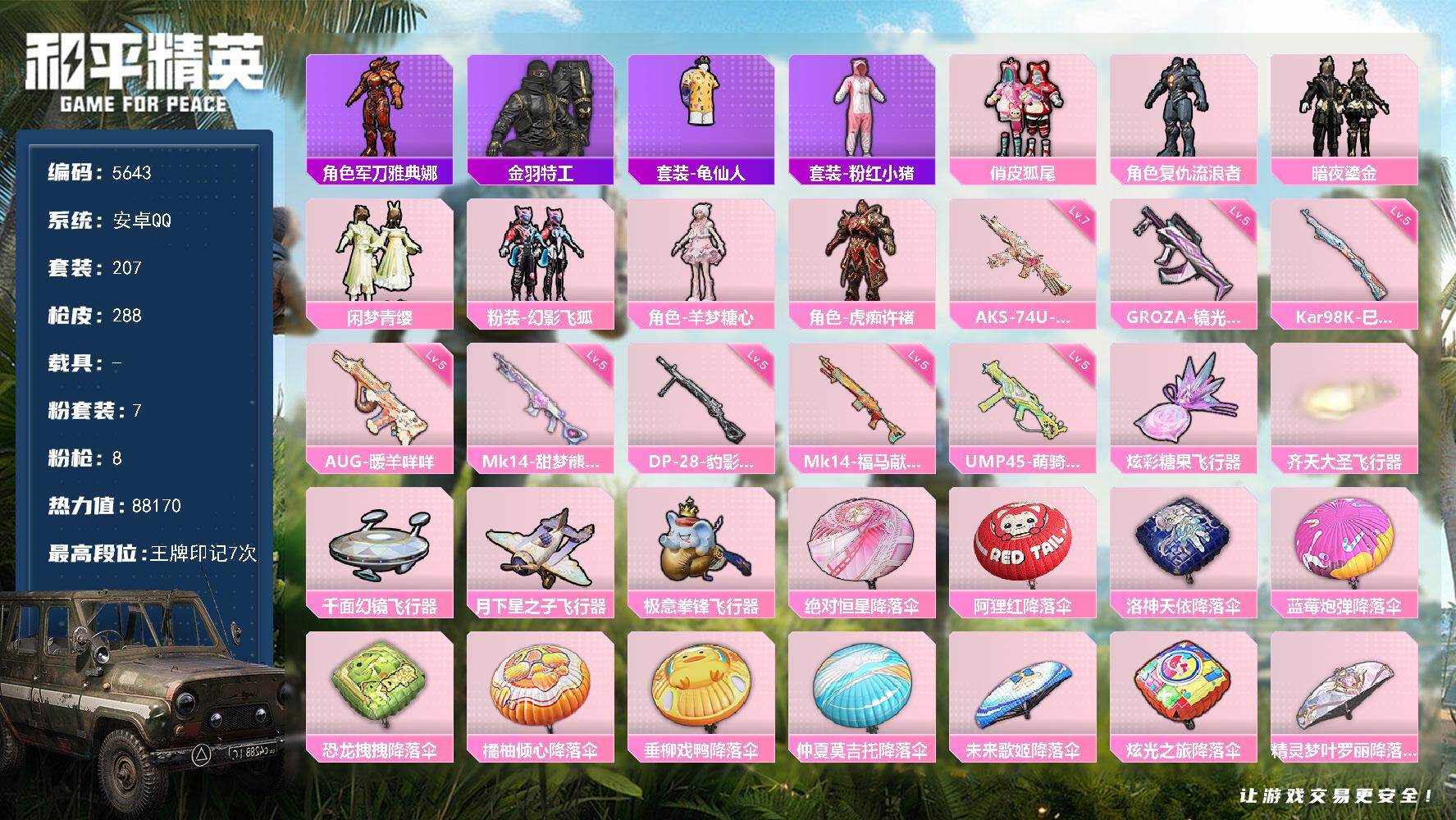 满级地铁安卓 手Q-7粉装-8特效枪-0载具-5粉色飞行器-88170热力值-