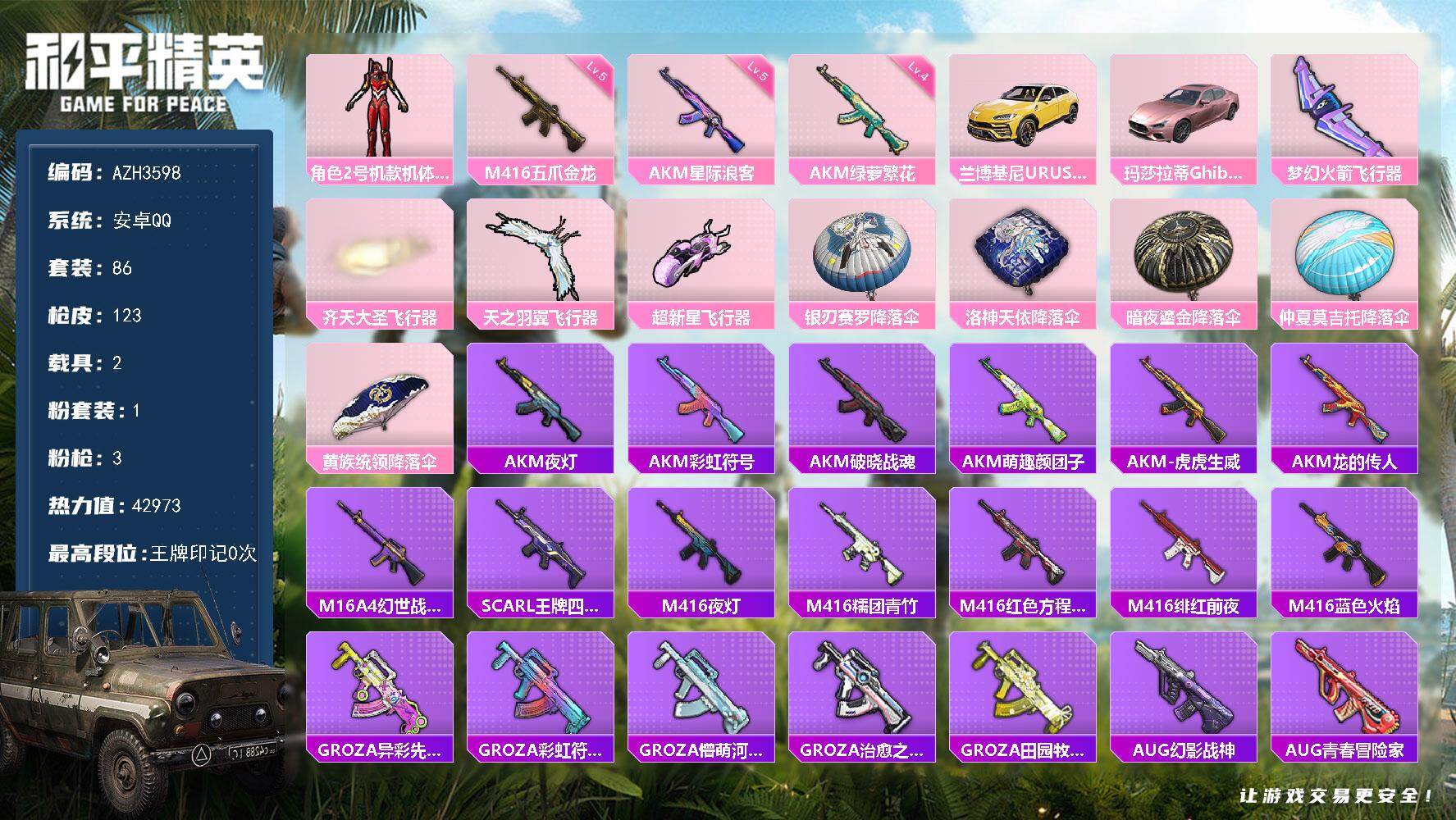 安卓 手Q-5粉装-11特效枪-0载具-2粉色飞行器-54073热力值-7王牌