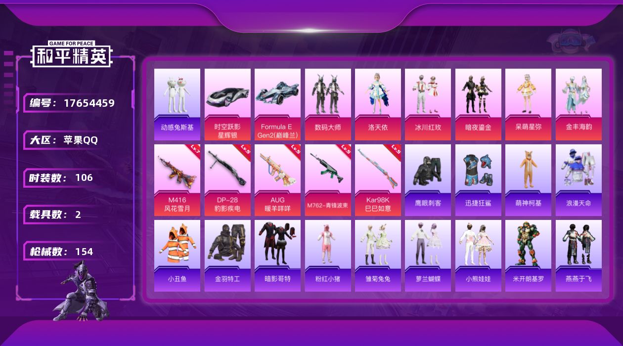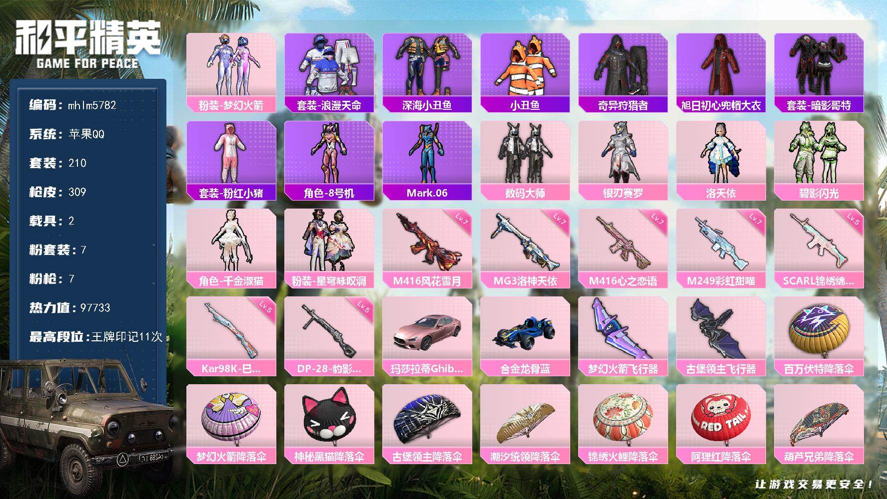 苹果 手Q-2粉装-3特效枪-0载具-2粉色飞行器-76211热力值-18王牌印