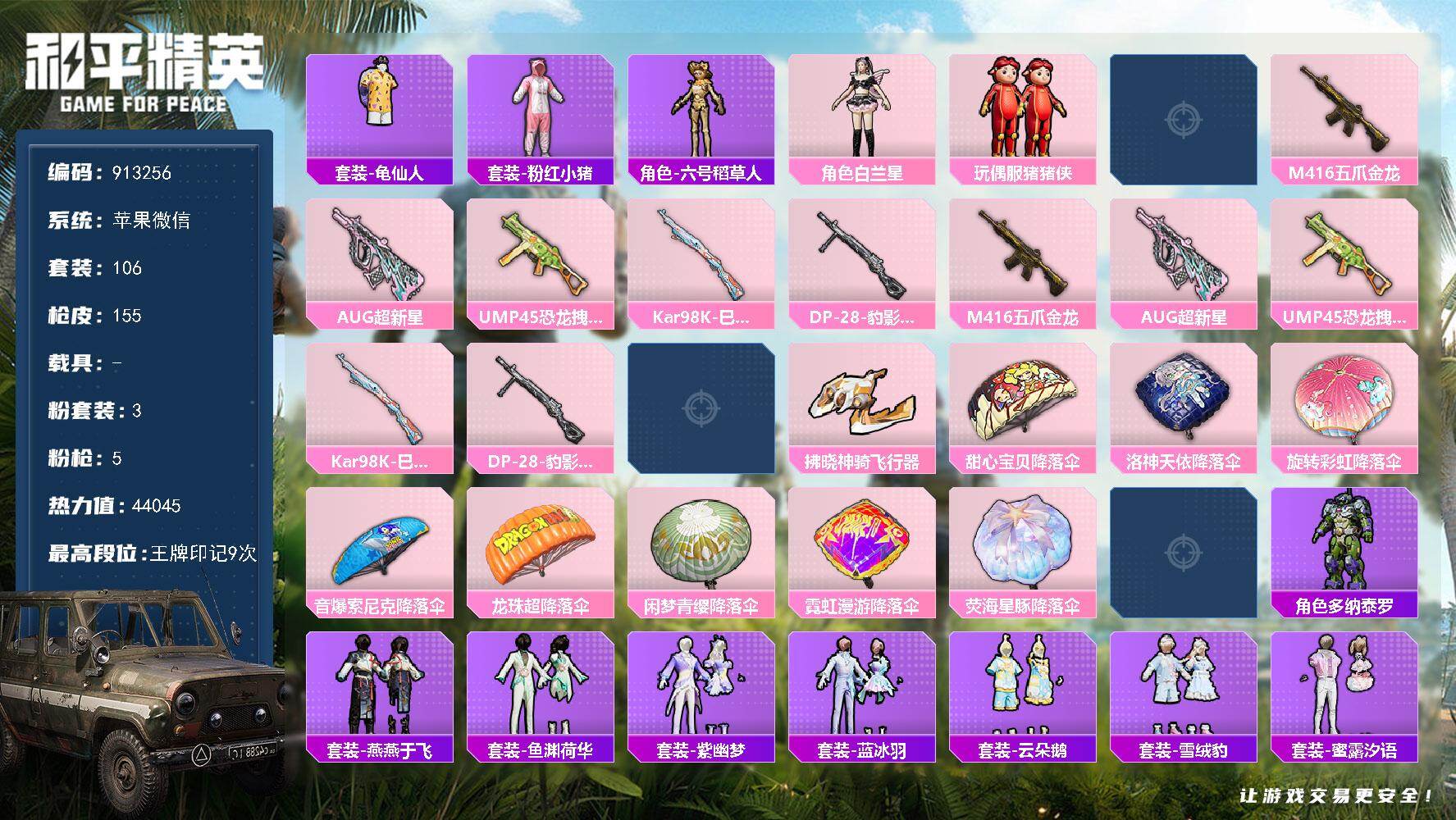 3粉装-5特效枪-0载具-2粉色飞行器-44045热力值-9王牌印记-106套装-155枪皮