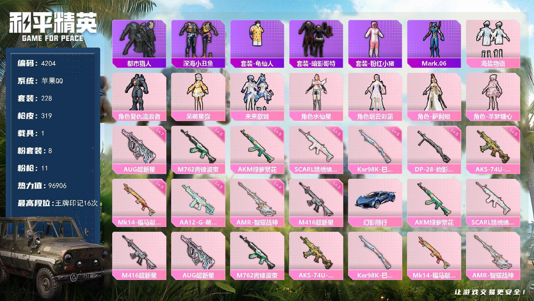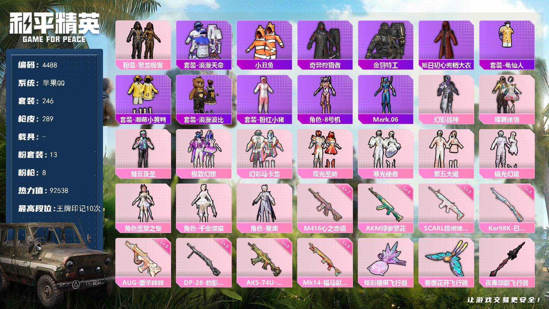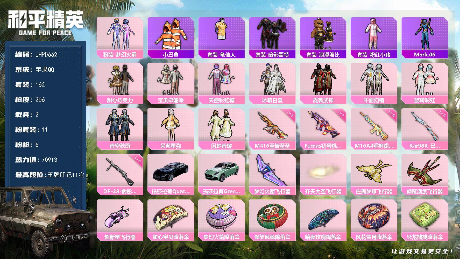 hs57122 苹果手Q-13王牌印记-10粉装-9特效枪-2载具-80748热力值-193套装-2