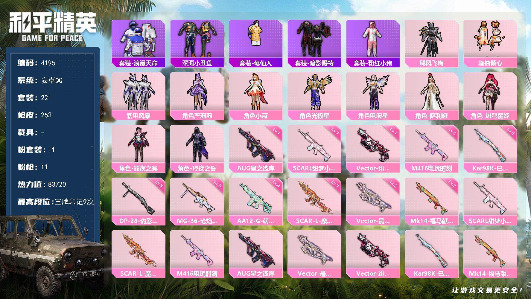 hs59210 安卓手Q-4王牌印记-1红装-4粉装-7特效枪-1载具-36613热力值-60套装-