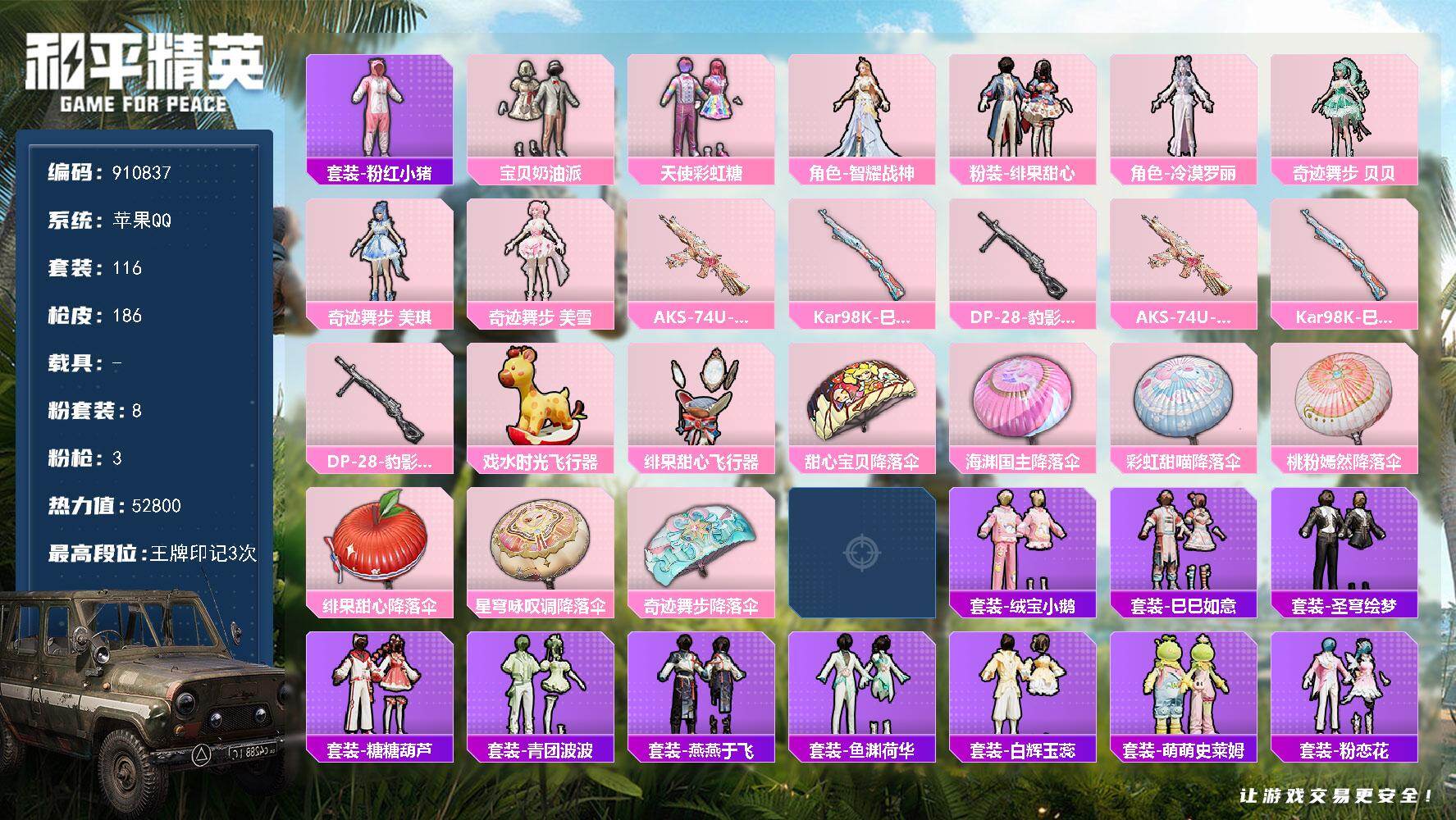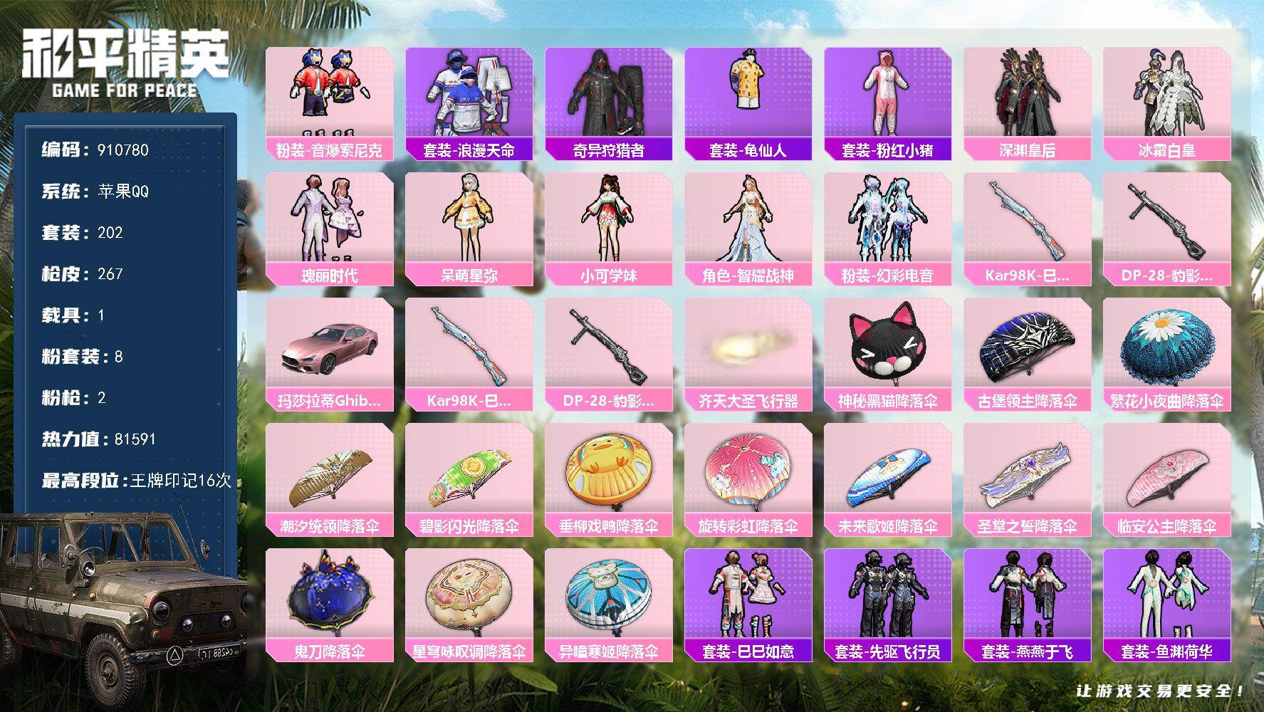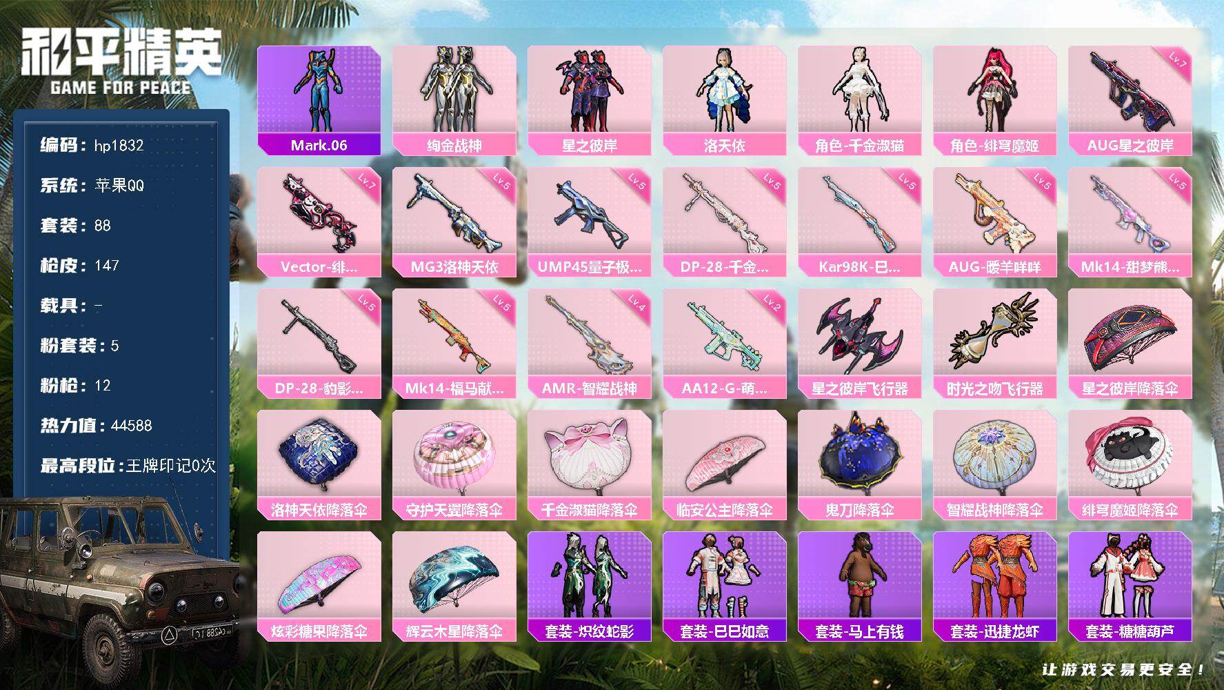 苹果 手Q-5粉装-12特效枪-0载具-2粉色飞行器-44588热力值-1王牌