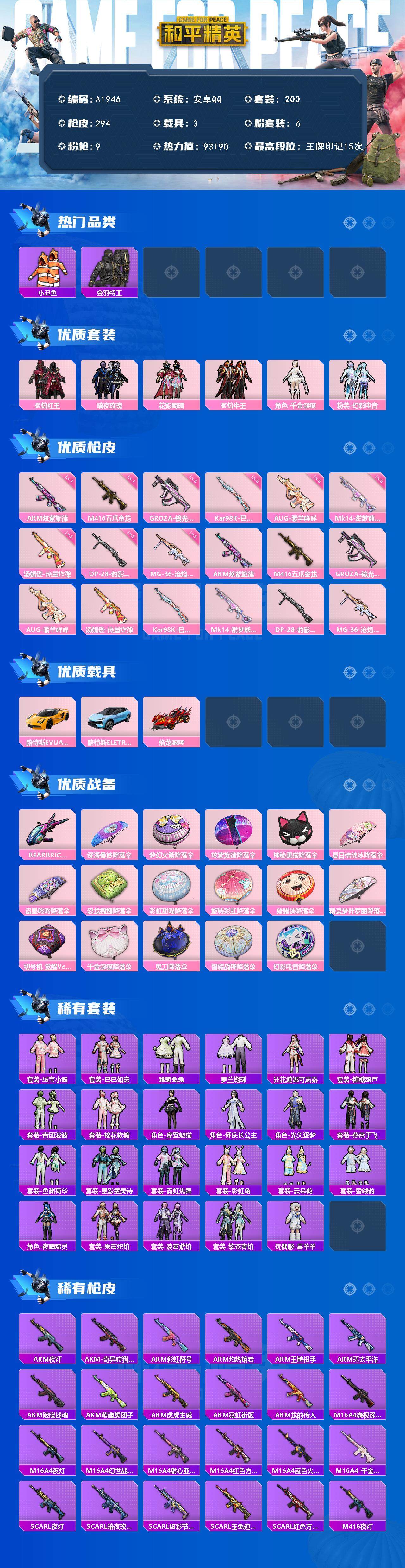 a4188/安卓QQ/-18王牌印记-5粉装-7特效枪-1载具-89177热力值-246套装-284