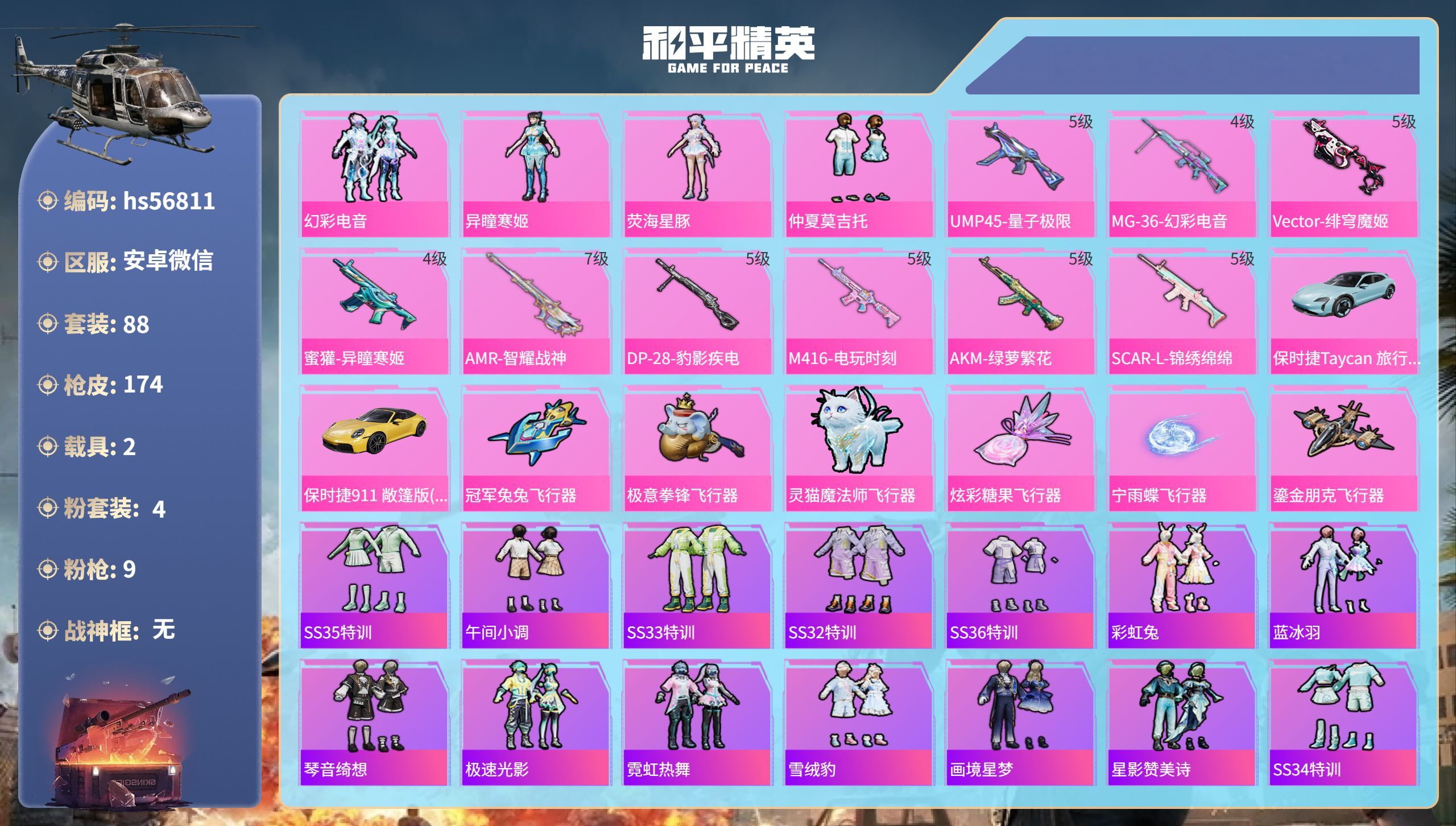 hs56811 安卓v-10王牌印记-4粉装-9特效枪-2载具-54215热力值-88套装-174