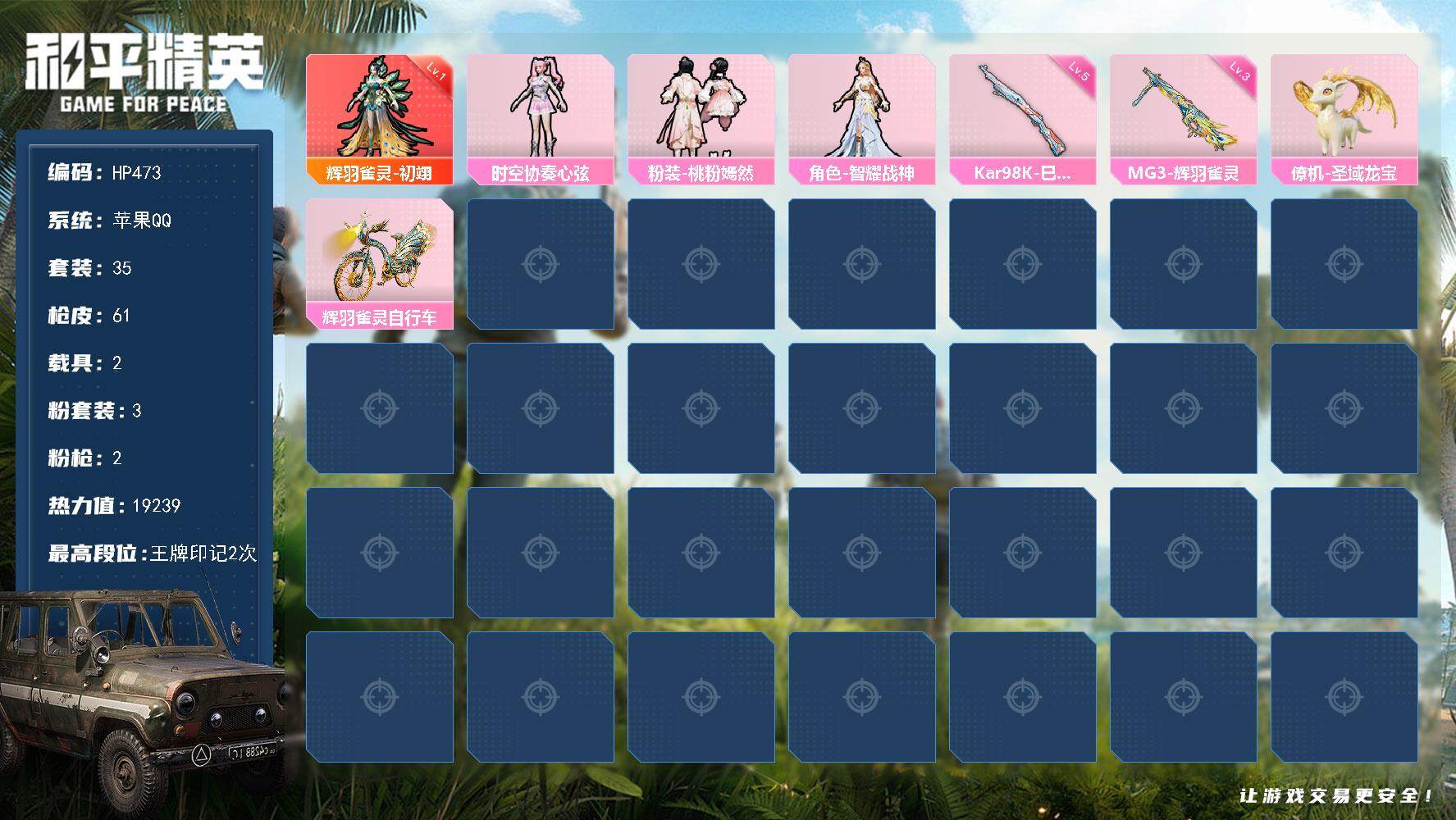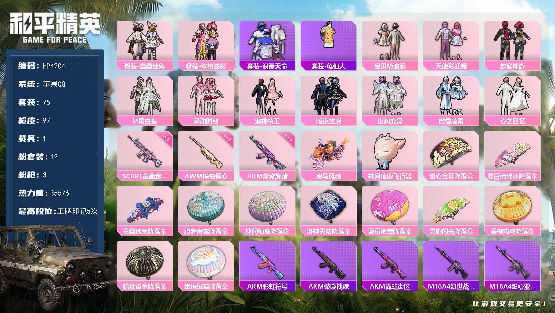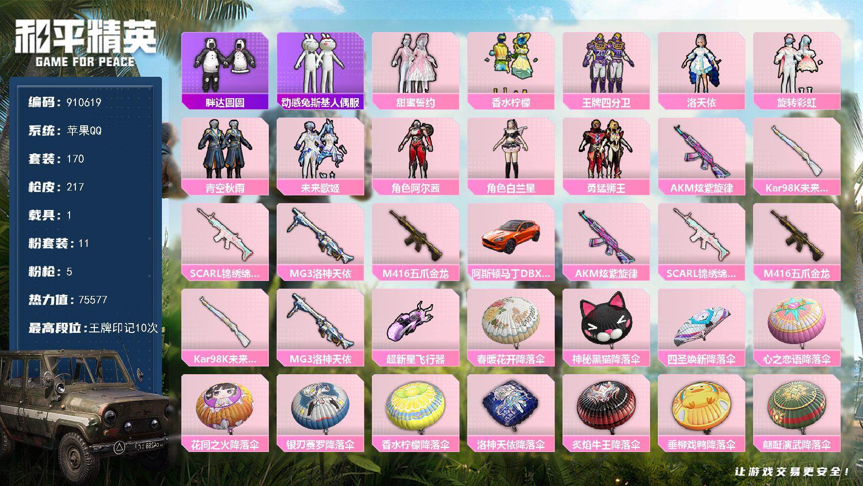 75套装/枪械3/装备114/载具1/战备76/王牌印记5/热力值35576/