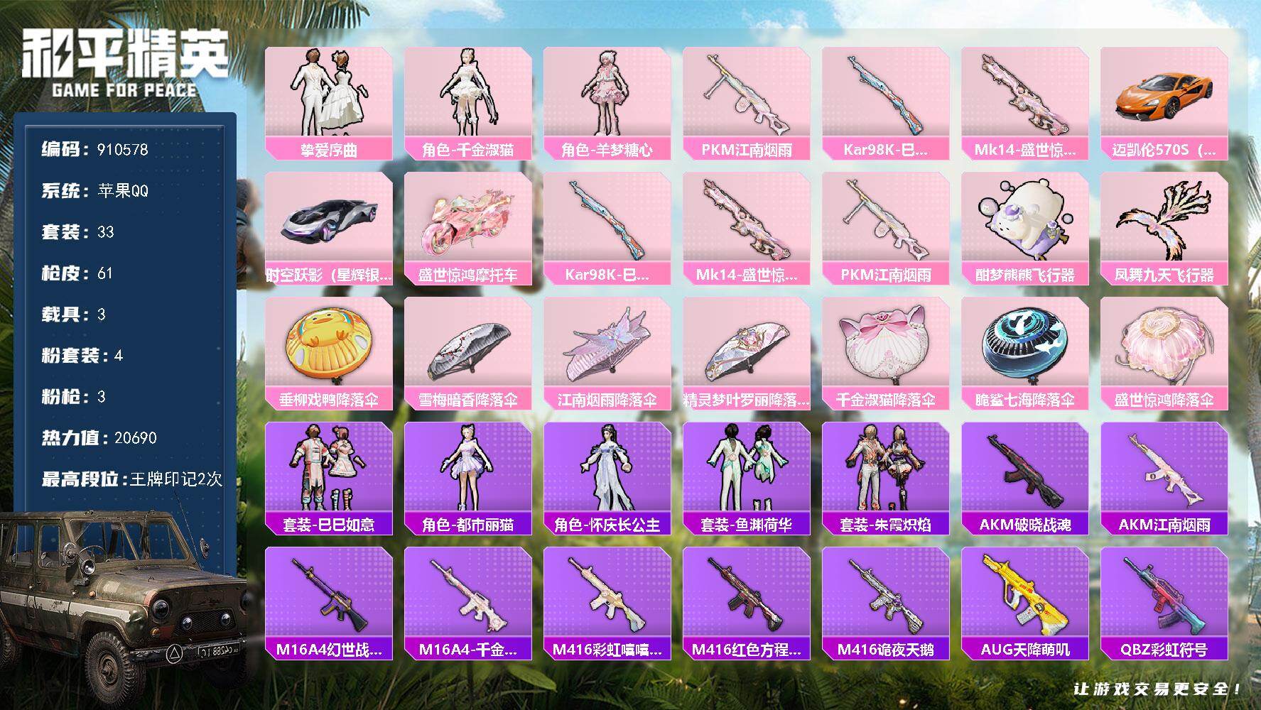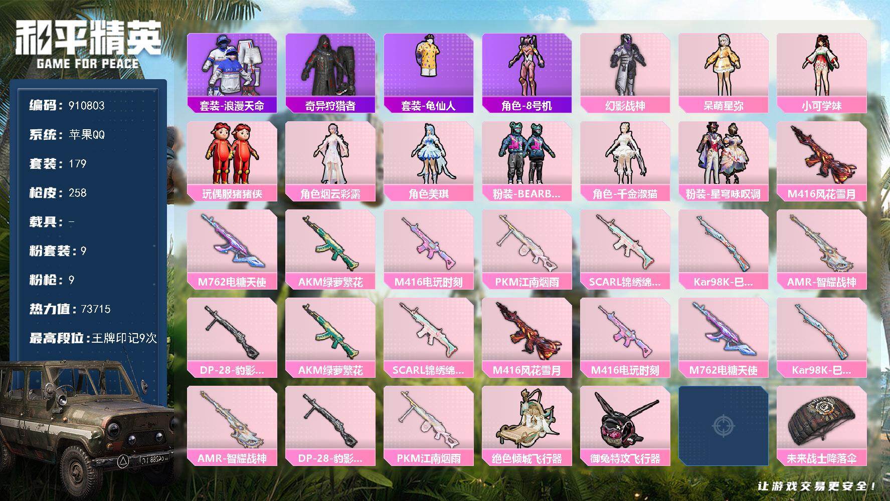 苹果 手Q-1神装-8粉装-11特效枪-0载具-6粉色飞行器-39118热力值