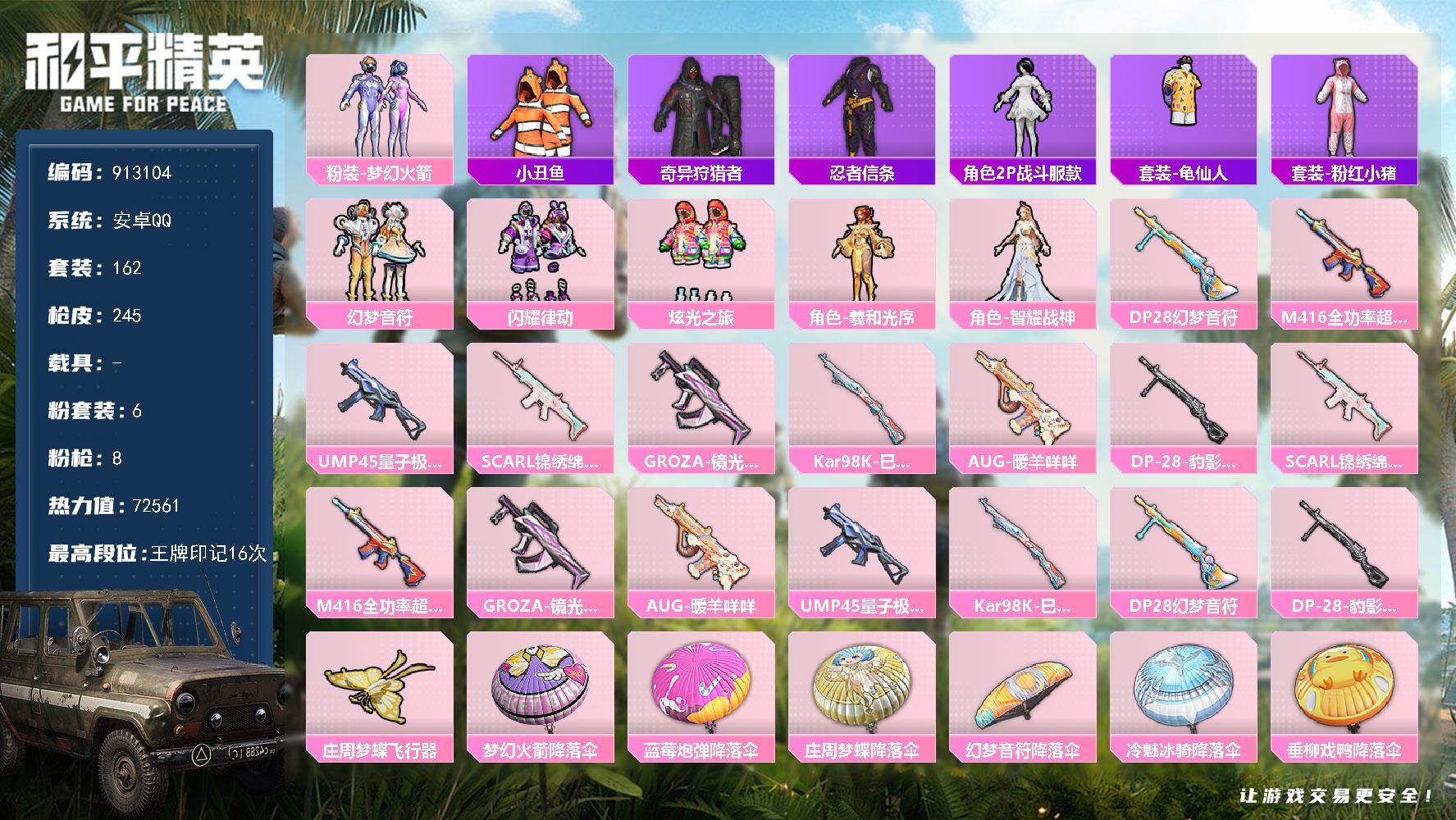 满级地铁安卓 手Q-5粉装-7特效枪-0载具-1粉色飞行器-60104热力值-1