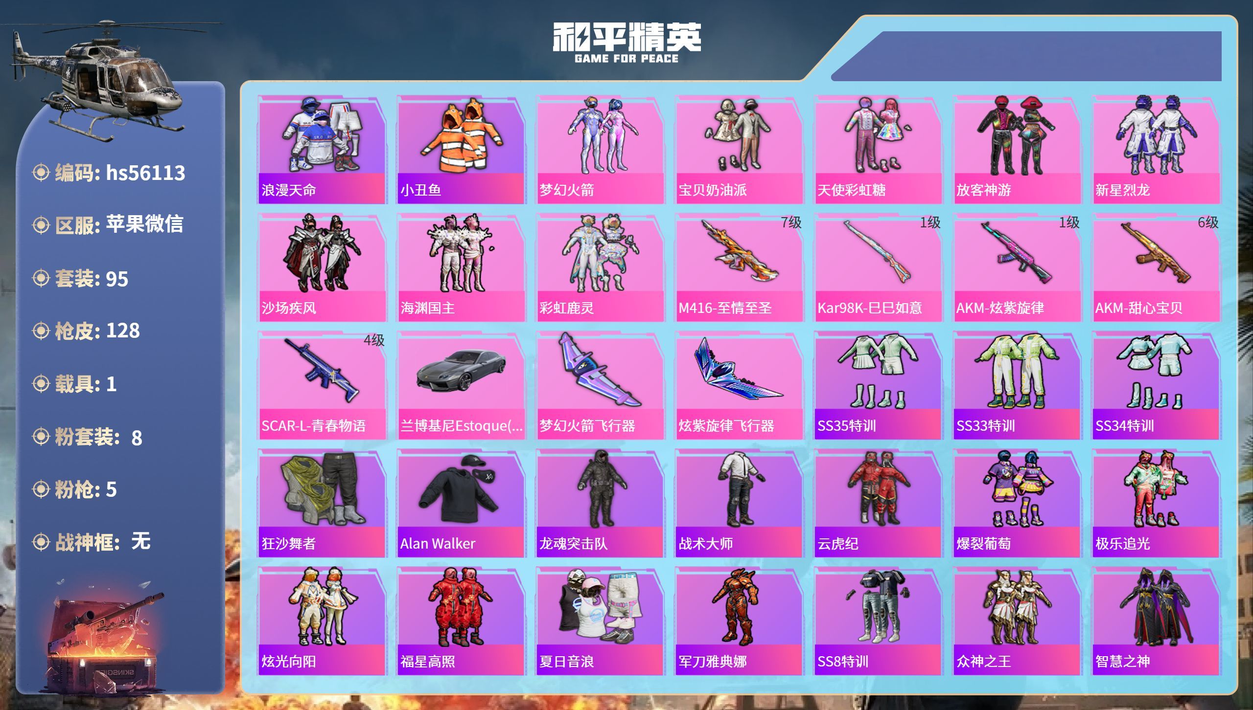 hs56113 苹果v-7王牌印记-8粉装-5特效枪-1载具-44621热力值-95套装-128枪