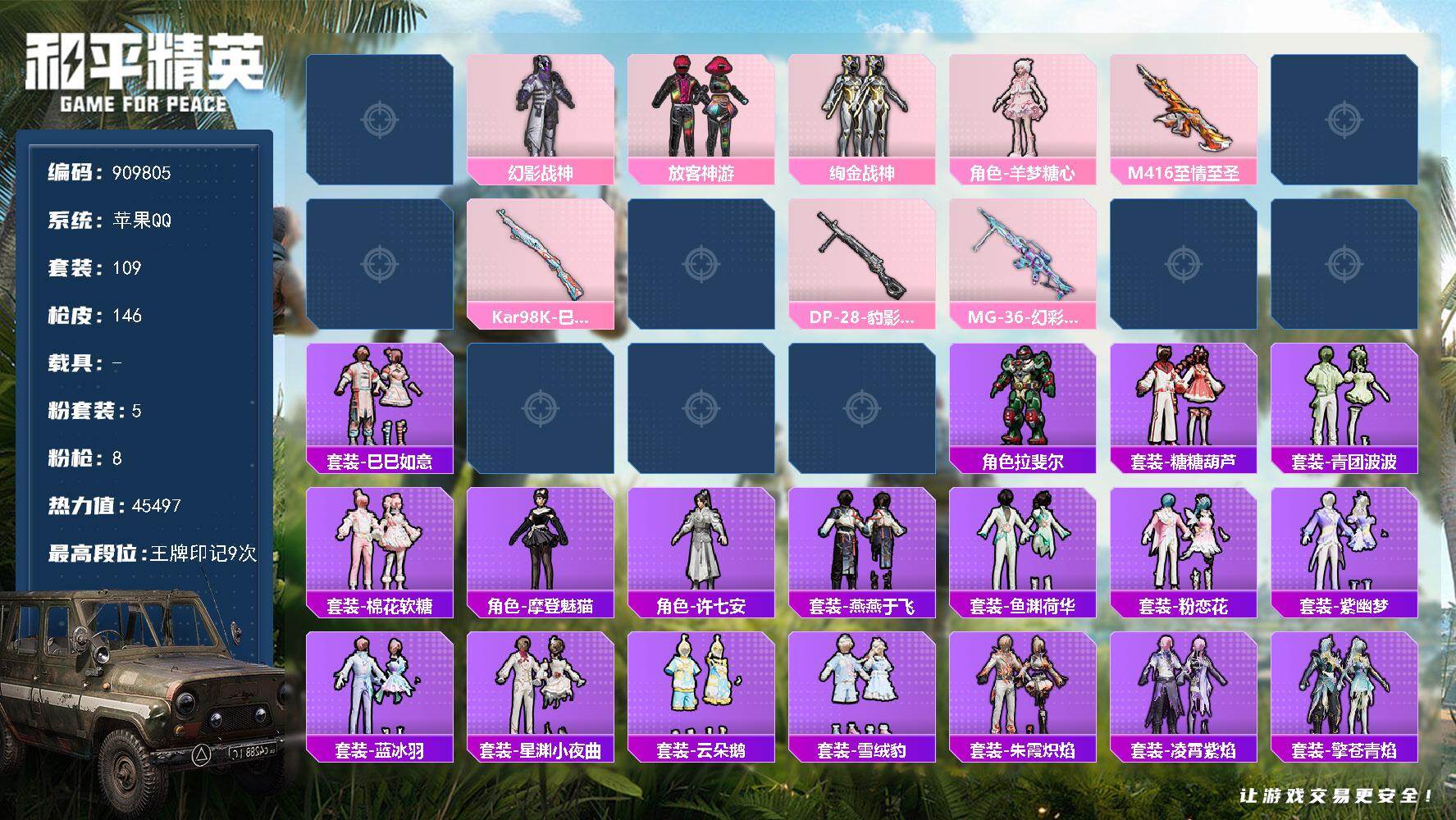 9王牌印记-5粉装-8特效枪-45497热力值-109套装-146枪皮-6卓越印记-3传奇印记