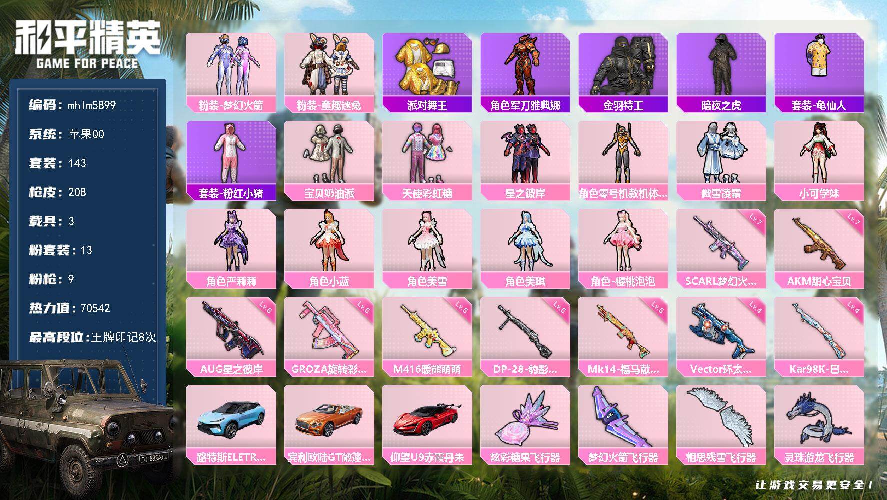 安卓手Q-4王牌印记-1红装-11粉装-5特效枪-1载具-50036热力值-124套装-139枪皮【