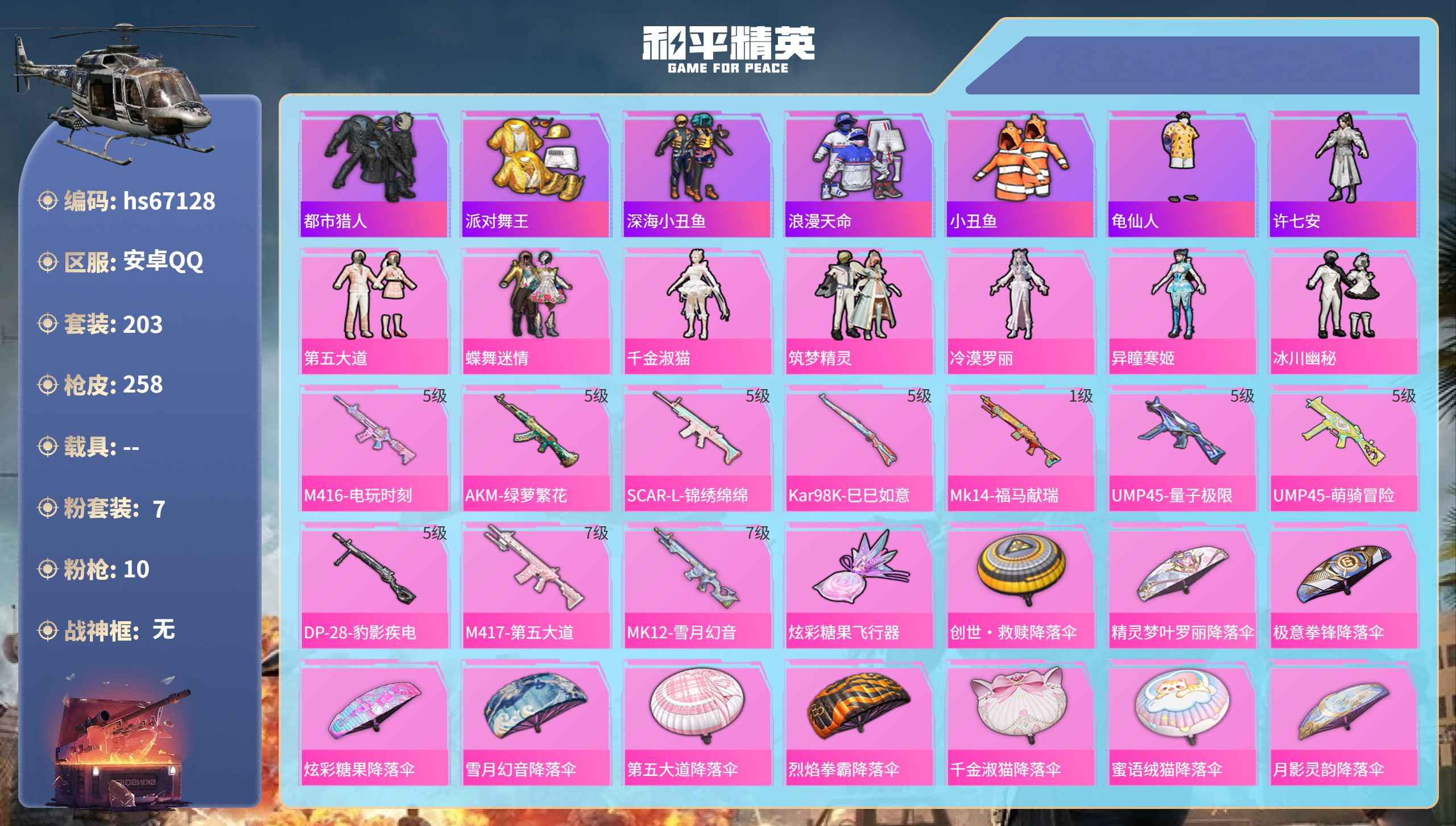 安卓 手Q-7粉装-16特效枪-0载具-2粉色飞行器-69665热力值-11王牌