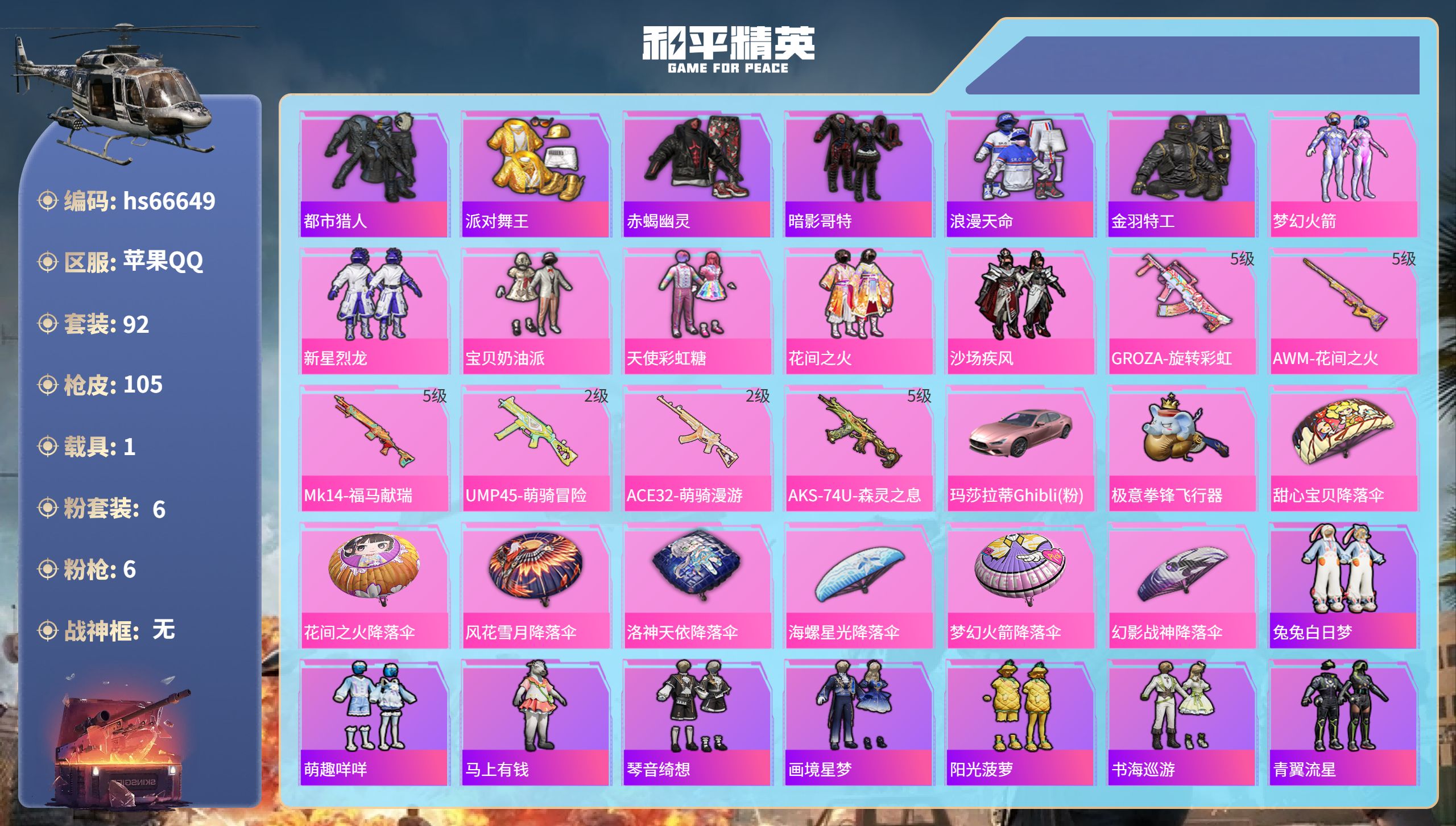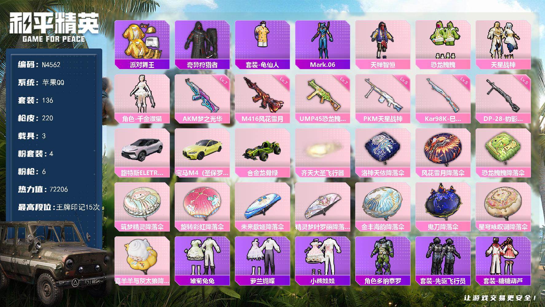 苹果 手Q-4粉装-6特效枪-3载具-1粉色飞行器-72206热力值-15王牌印