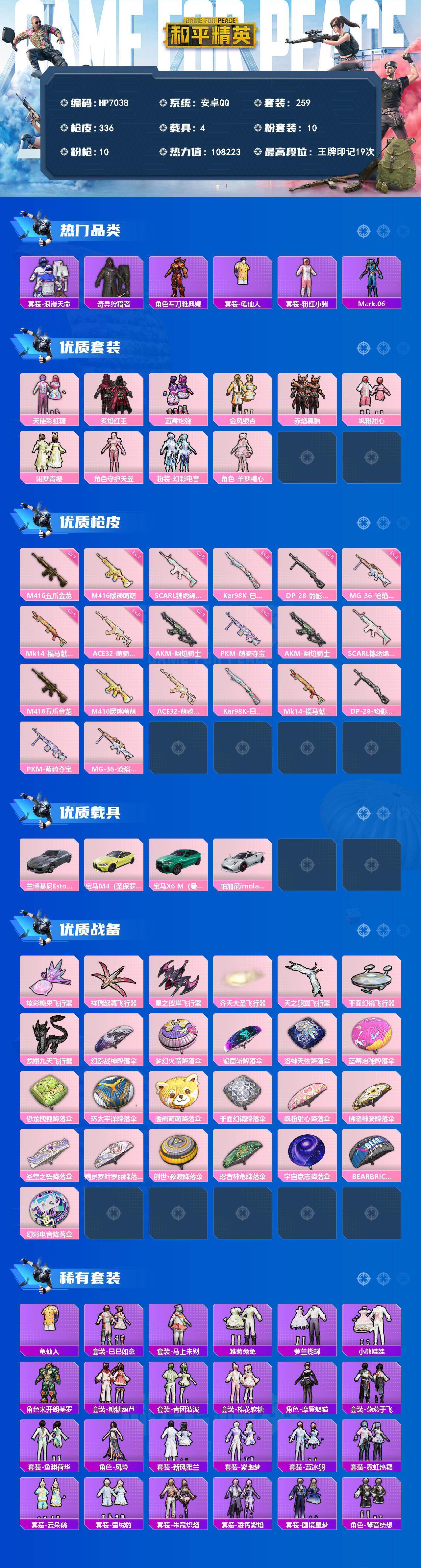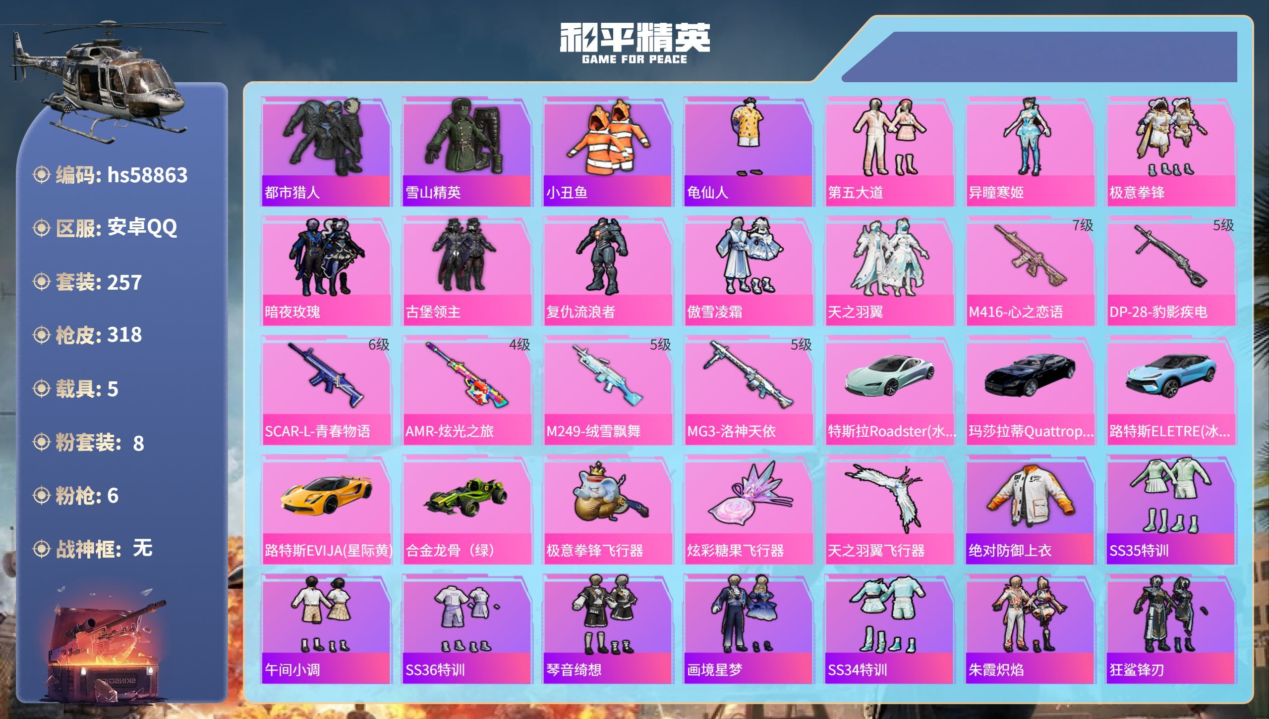 hs58863 安卓手Q-22王牌印记-8粉装-6特效枪-5载具-109135热力值-257套装-3