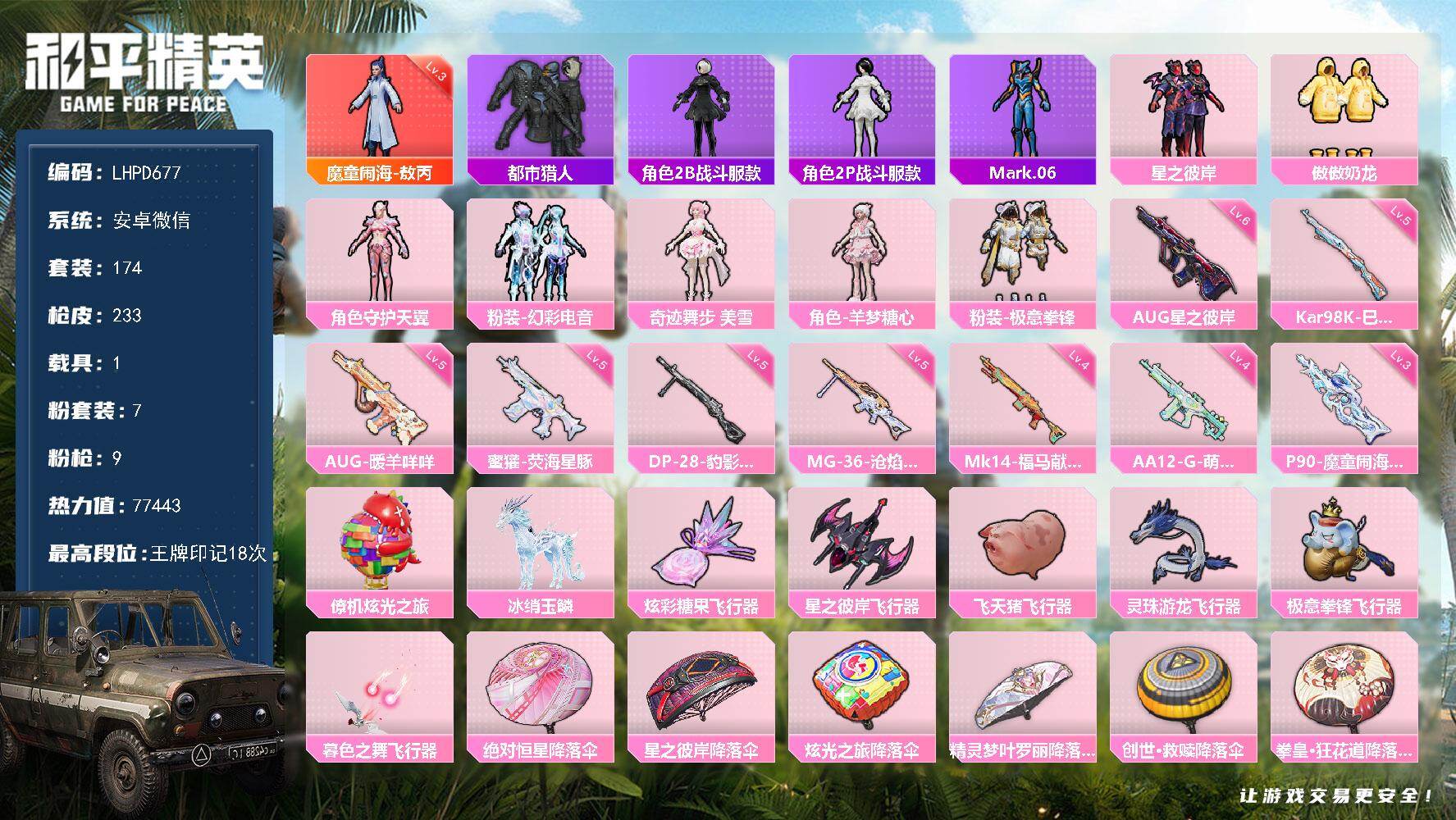 【店主推荐捡漏号!可直接换绑】安卓 微信-1神装-7粉装-9特效枪-1载具-6