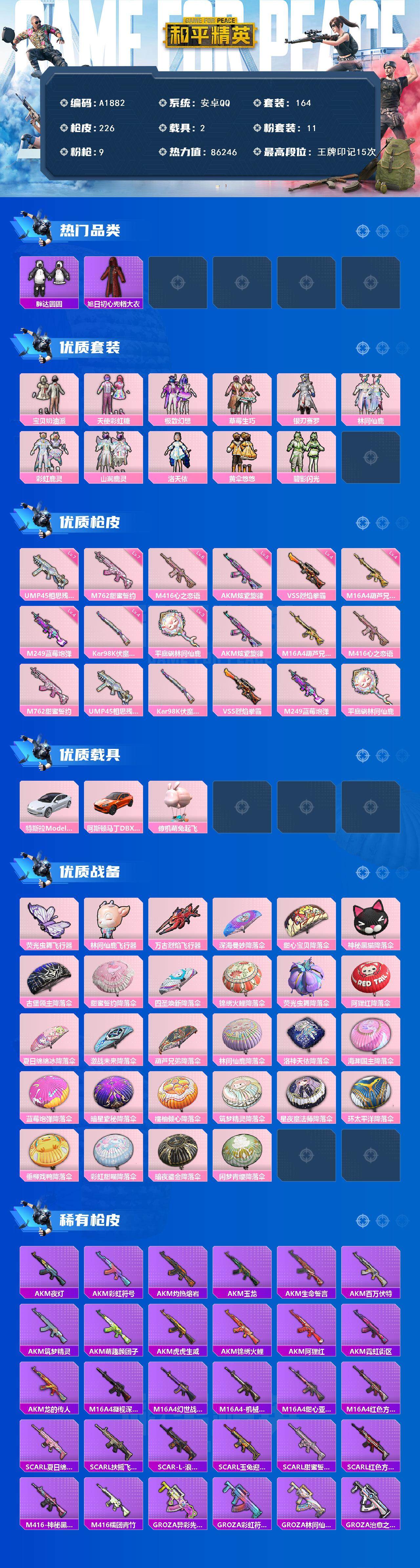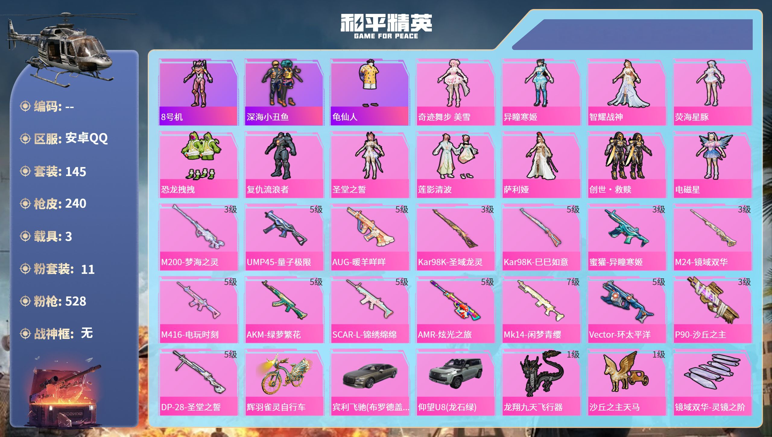 安卓手Q-7王牌印记-11粉装-15特效枪-3载具-88009热力值-145套装-240枪皮-5卓越