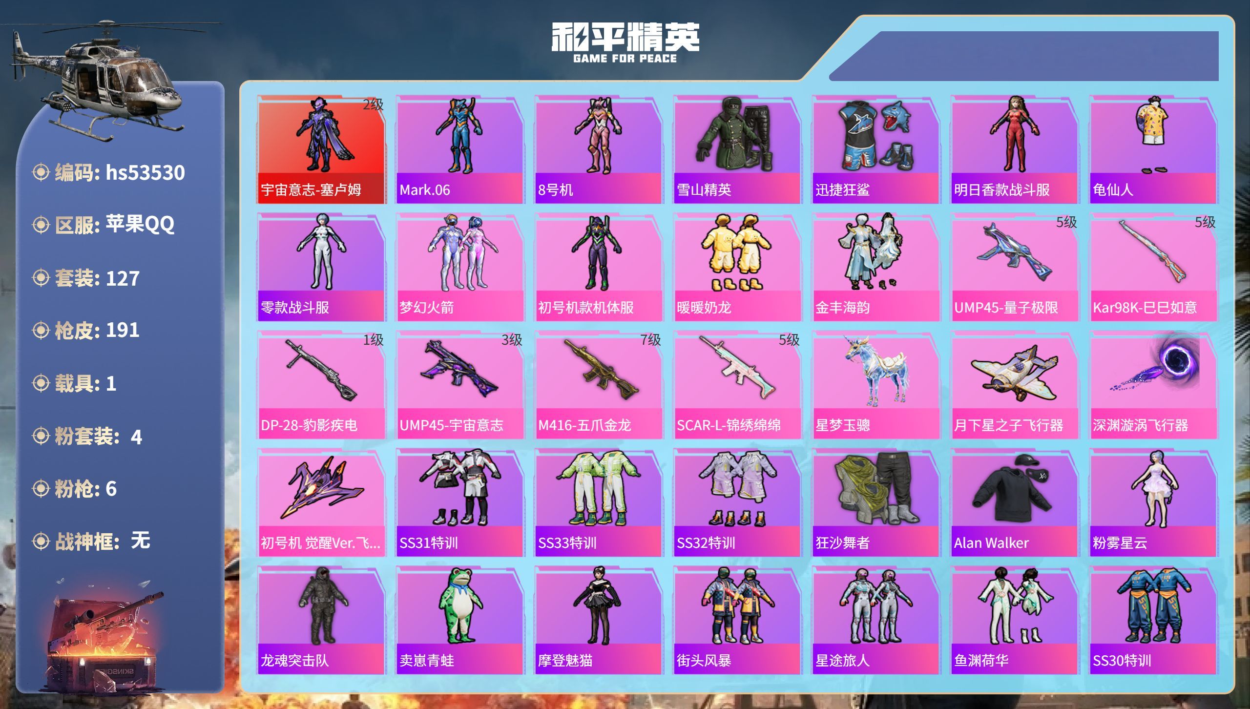a4045/苹果QQ/-12王牌印记-7粉装-9特效枪-5载具-86993热力值-202套装-242