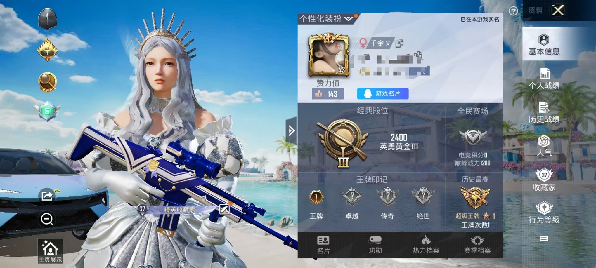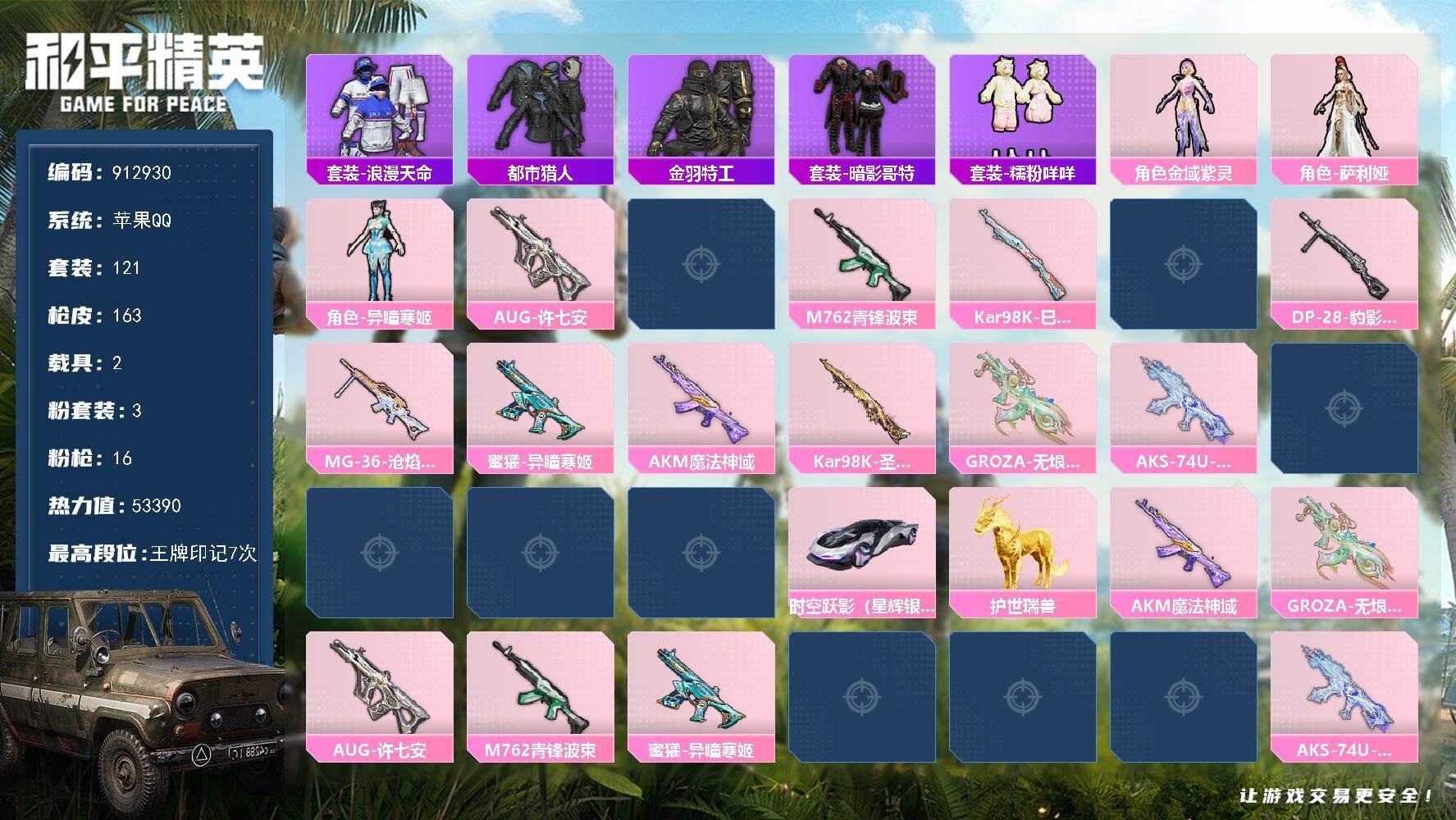 121套装/枪械16/装备192/载具2/战备119/王牌印记7/热力值53390/