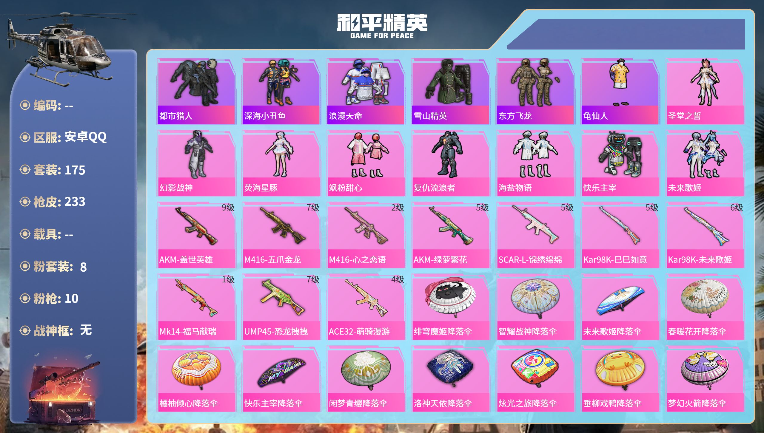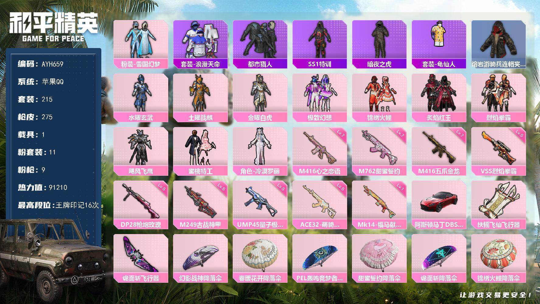 11粉装-9特效枪-1载具-2粉色飞行器-91210热力值-16王牌印记-215套装-275枪皮