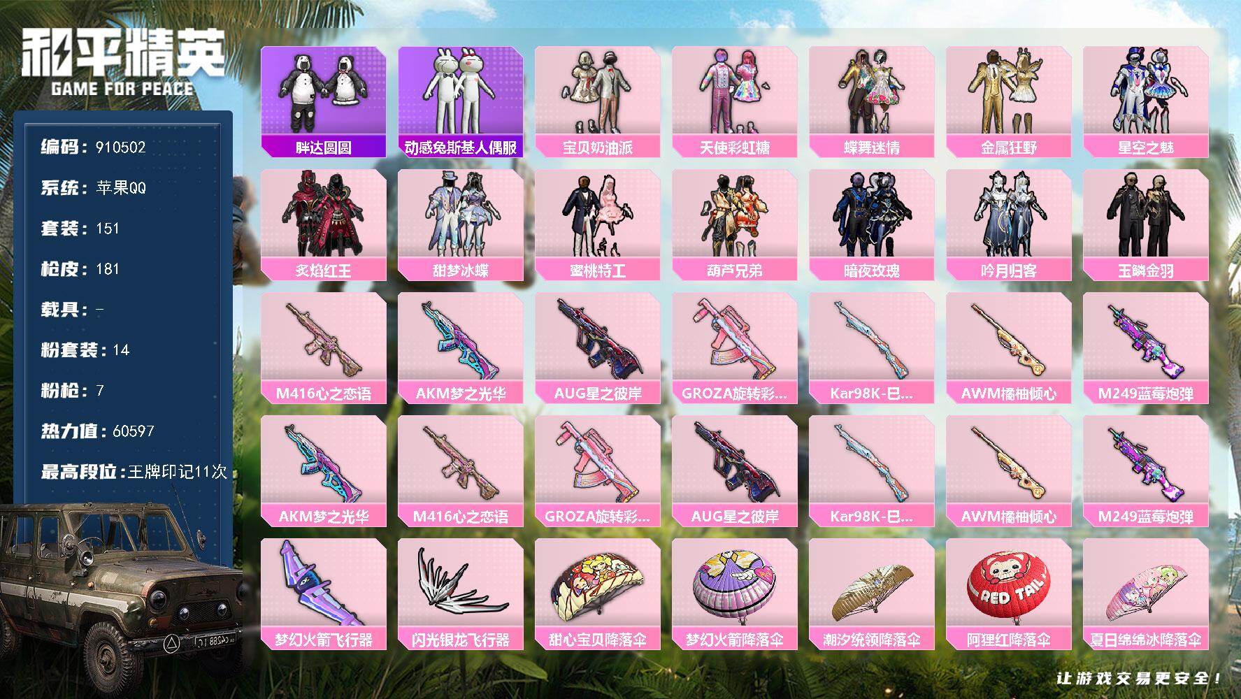 15粉装-6特效枪-1载具-4粉色飞行器-62930热力值-7王牌印记-136套装-188枪皮