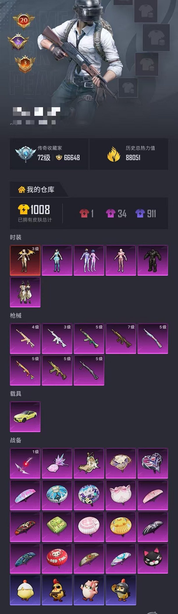 279套装/枪械13/装备572/载具3/战备296/王牌印记17/热力值137119/