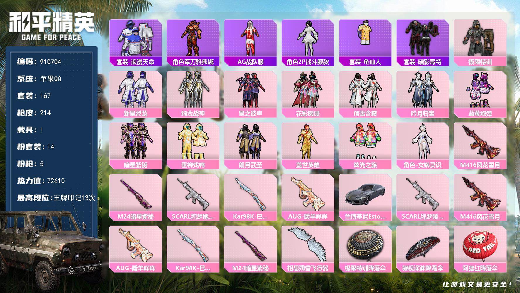 167套装/枪械5/装备295/载具1/战备125/王牌印记13/热力值72610/