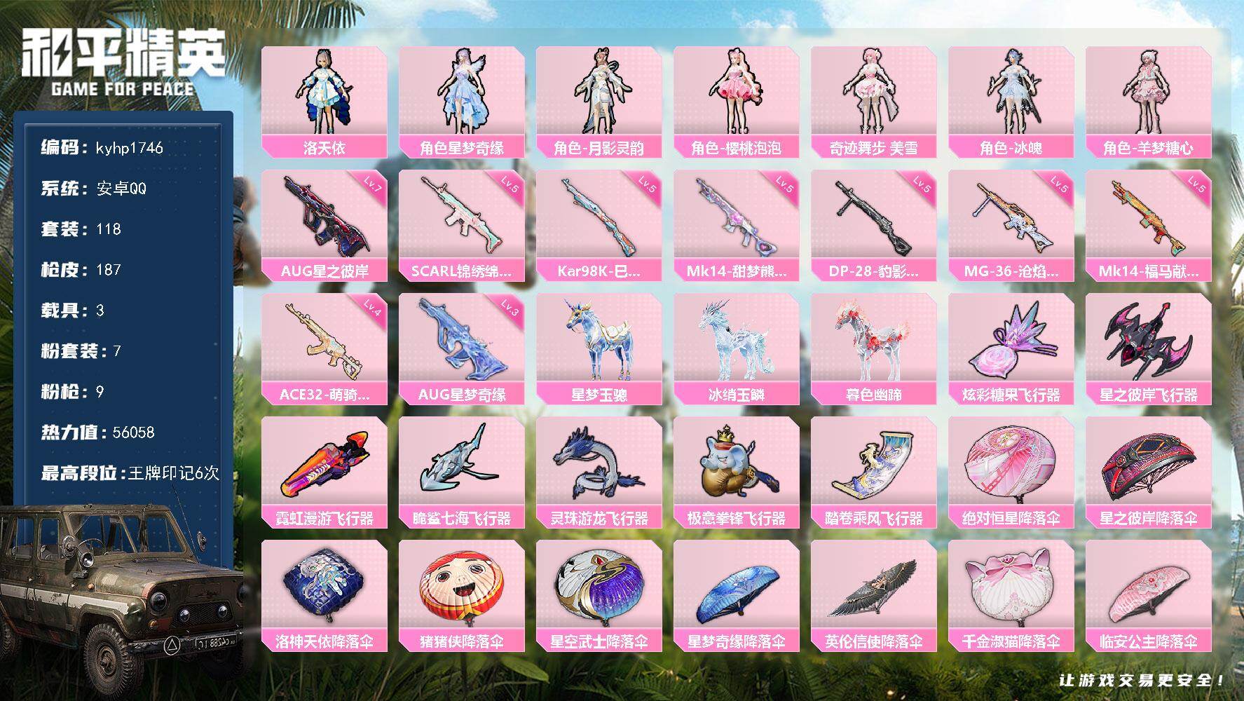 安卓 手Q-7粉装-9特效枪-3载具-7粉色飞行器-56058热力值-6王牌印