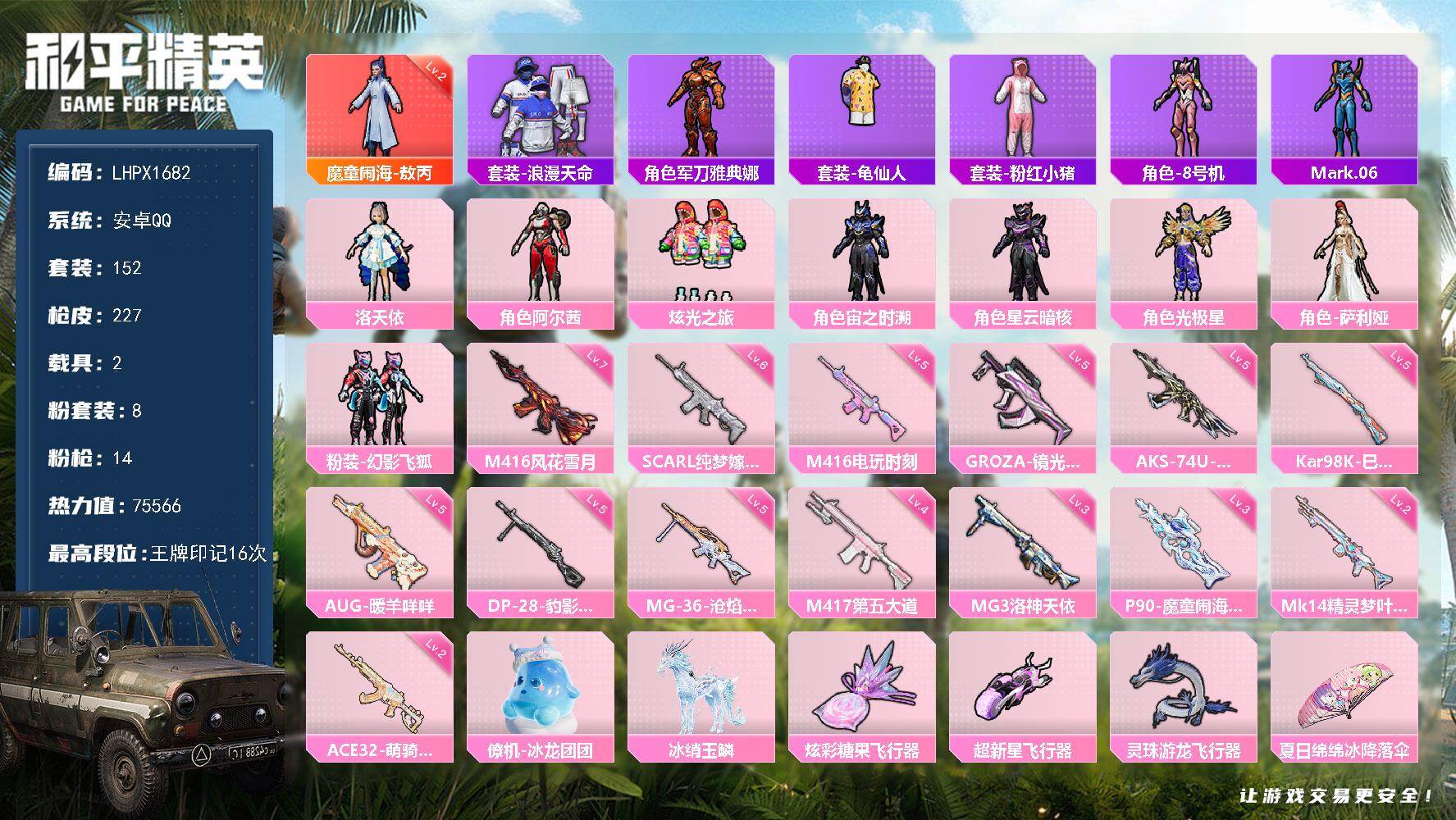 hs61641 苹果手Q-16王牌印记-7粉装-9特效枪-2载具-58267热力值-138套装-18