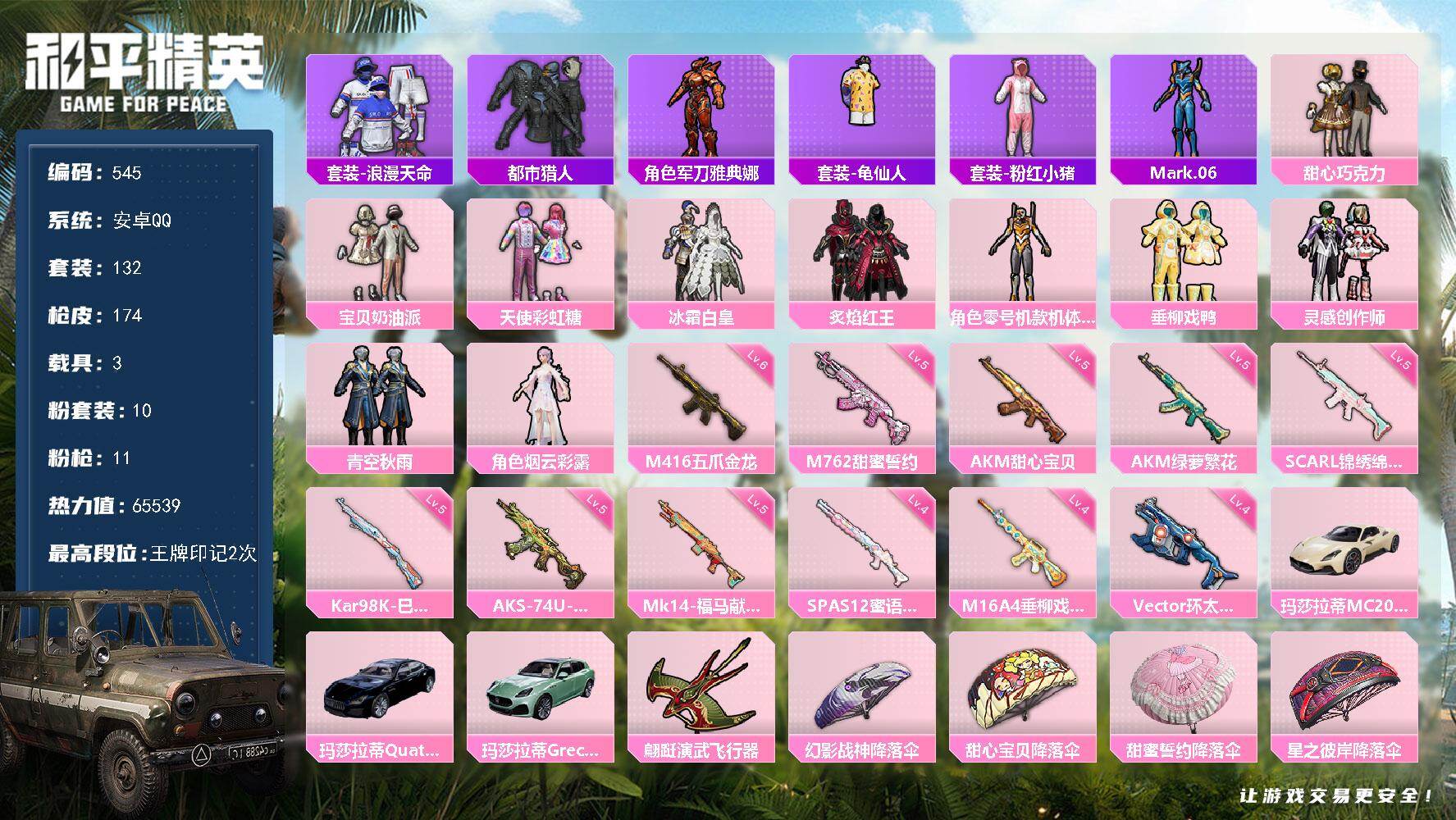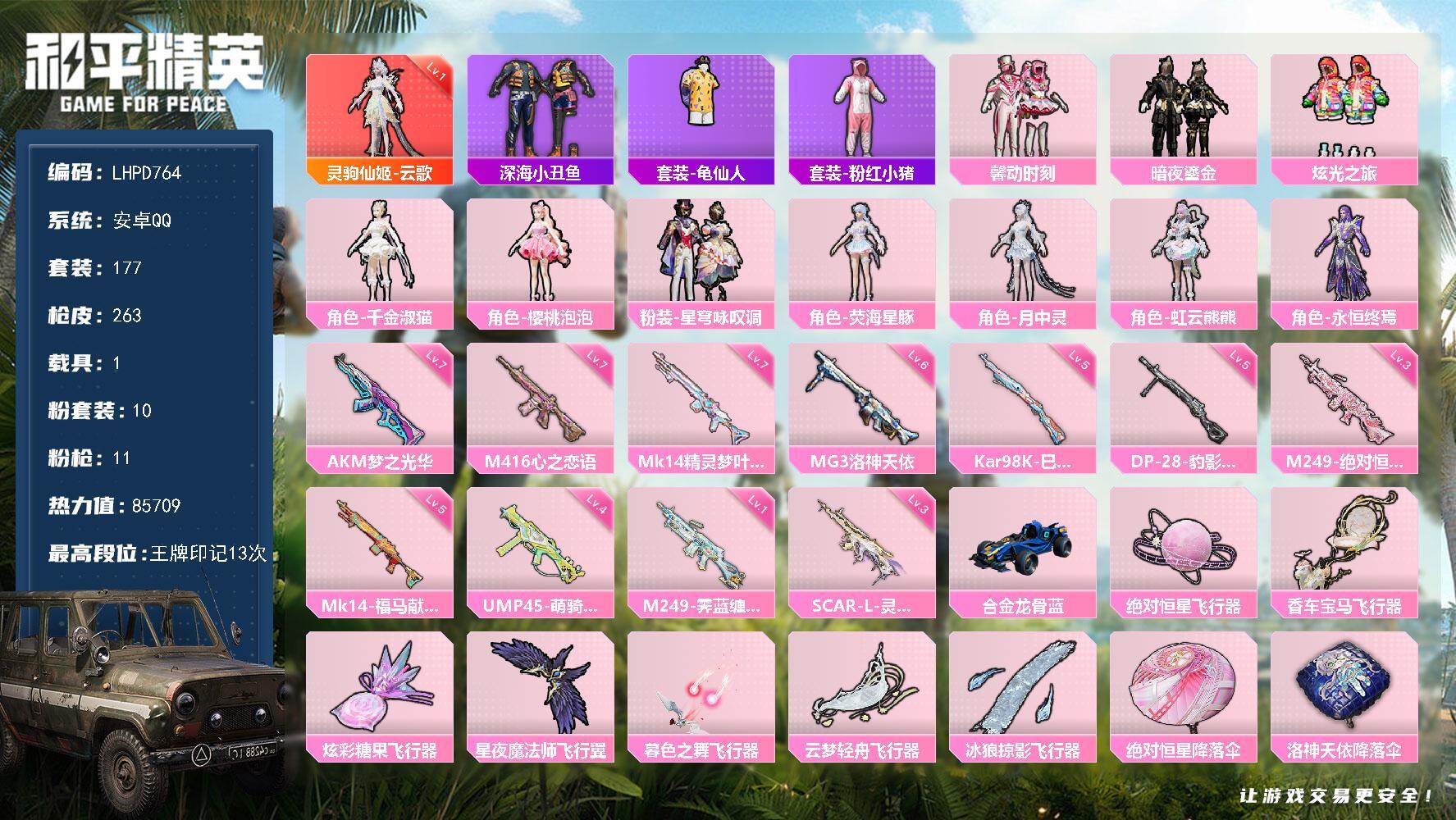 安卓 手Q-1神装-6粉装-7特效枪-4载具-5粉色飞行器-72481热力值-