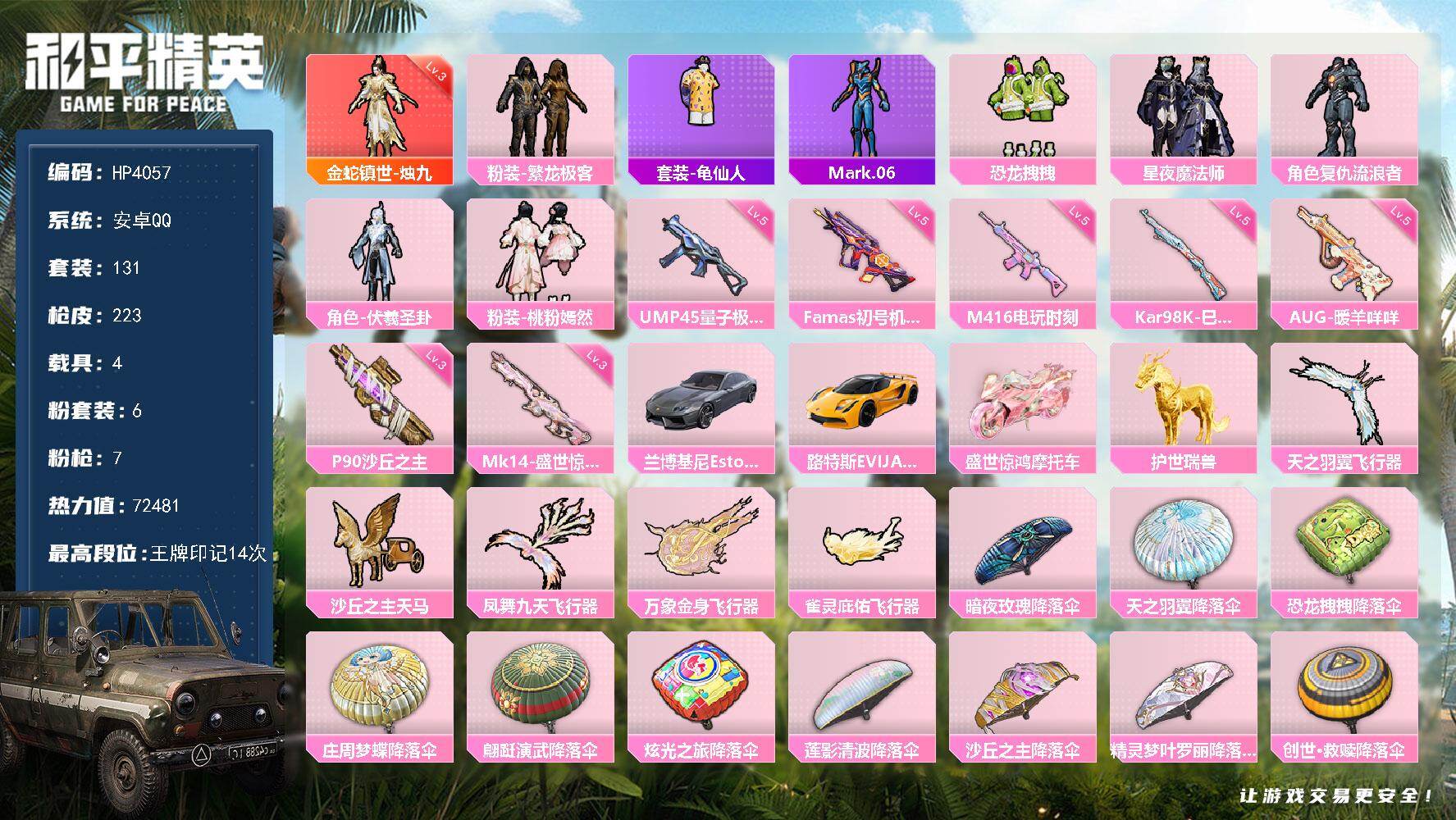 hs62338 安卓微-9王牌印记-13粉装-9特效枪-4载具-78016热力值-154套装-19