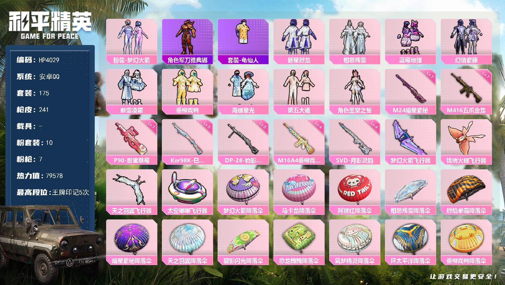安卓 手Q-10粉装-7特效枪-0载具-4粉色飞行器-79578热力值-5王牌