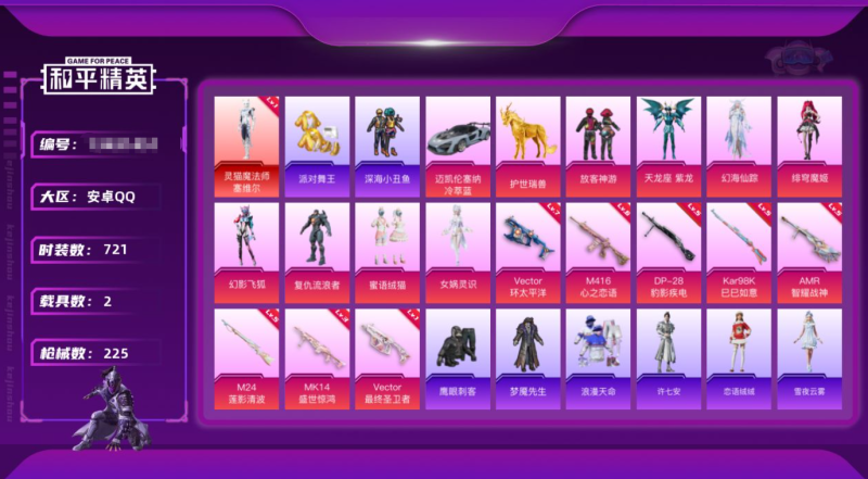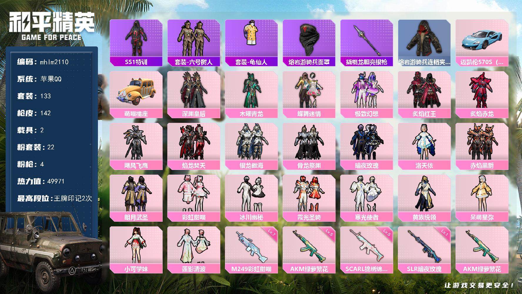 1载具-198套装-210枪皮-苹果手Q-可二次-极品老号