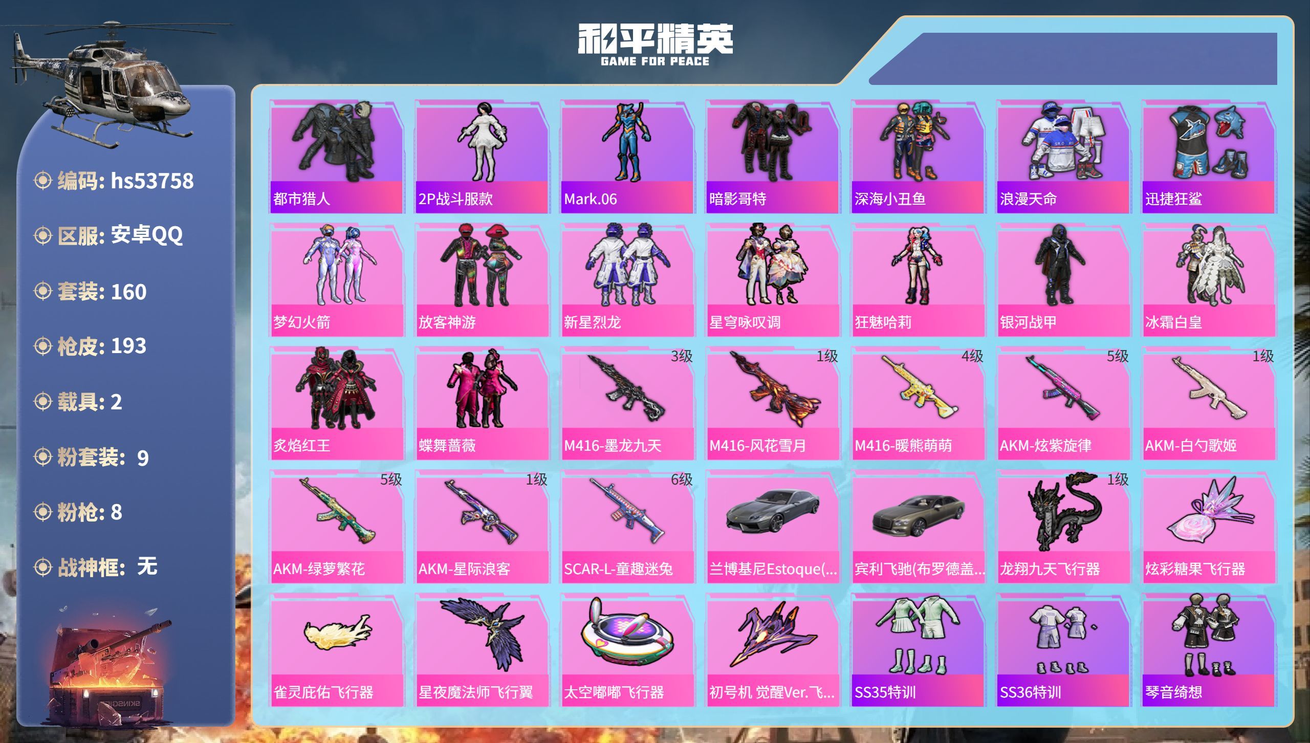 hs53758 安卓手Q-4王牌印记-9粉装-8特效枪-2载具-61716热力值-160套装-193