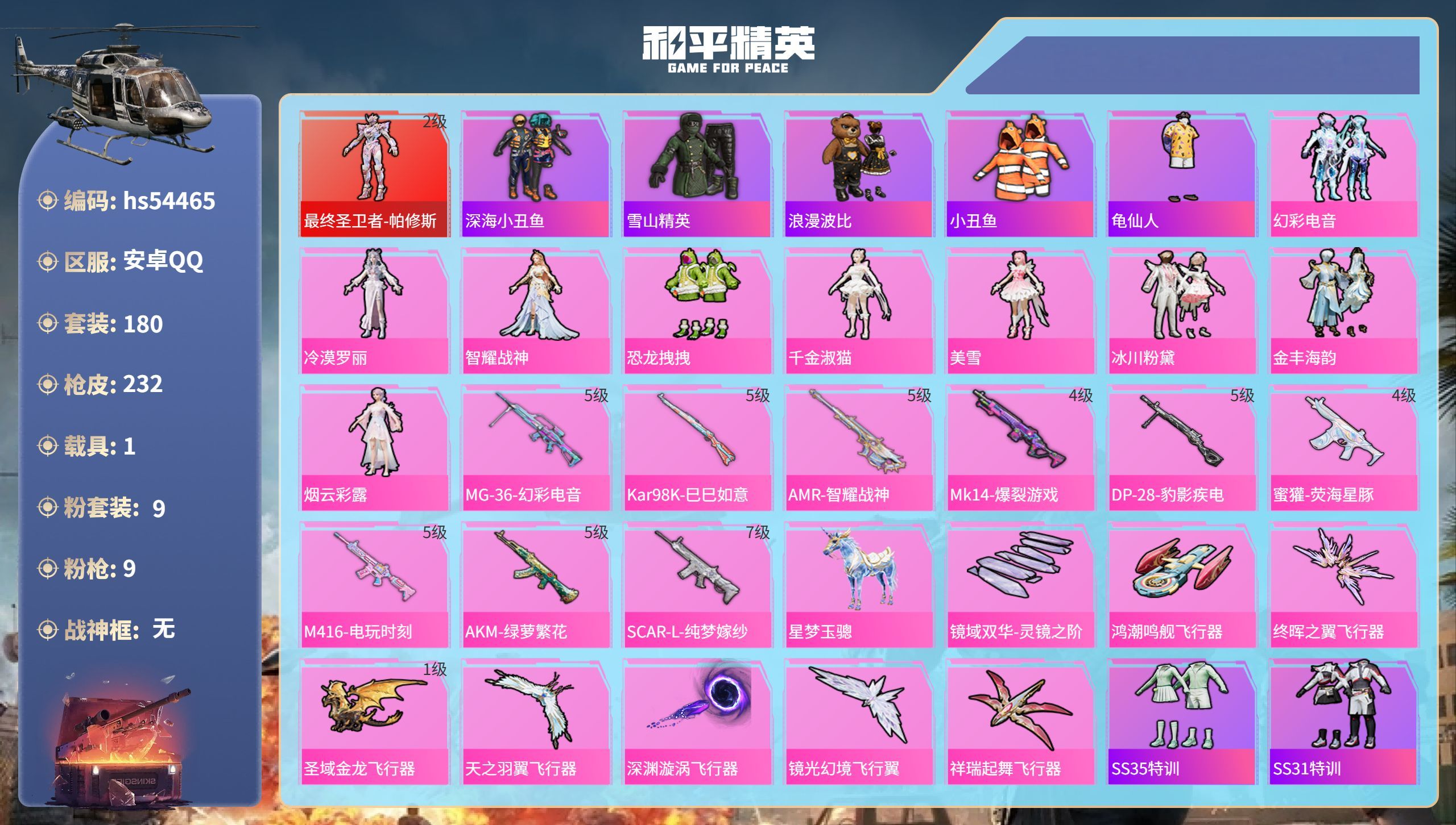 hs54465 安卓手Q-13王牌印记-1红装-9粉装-9特效枪-1载具-81731热力值-180套