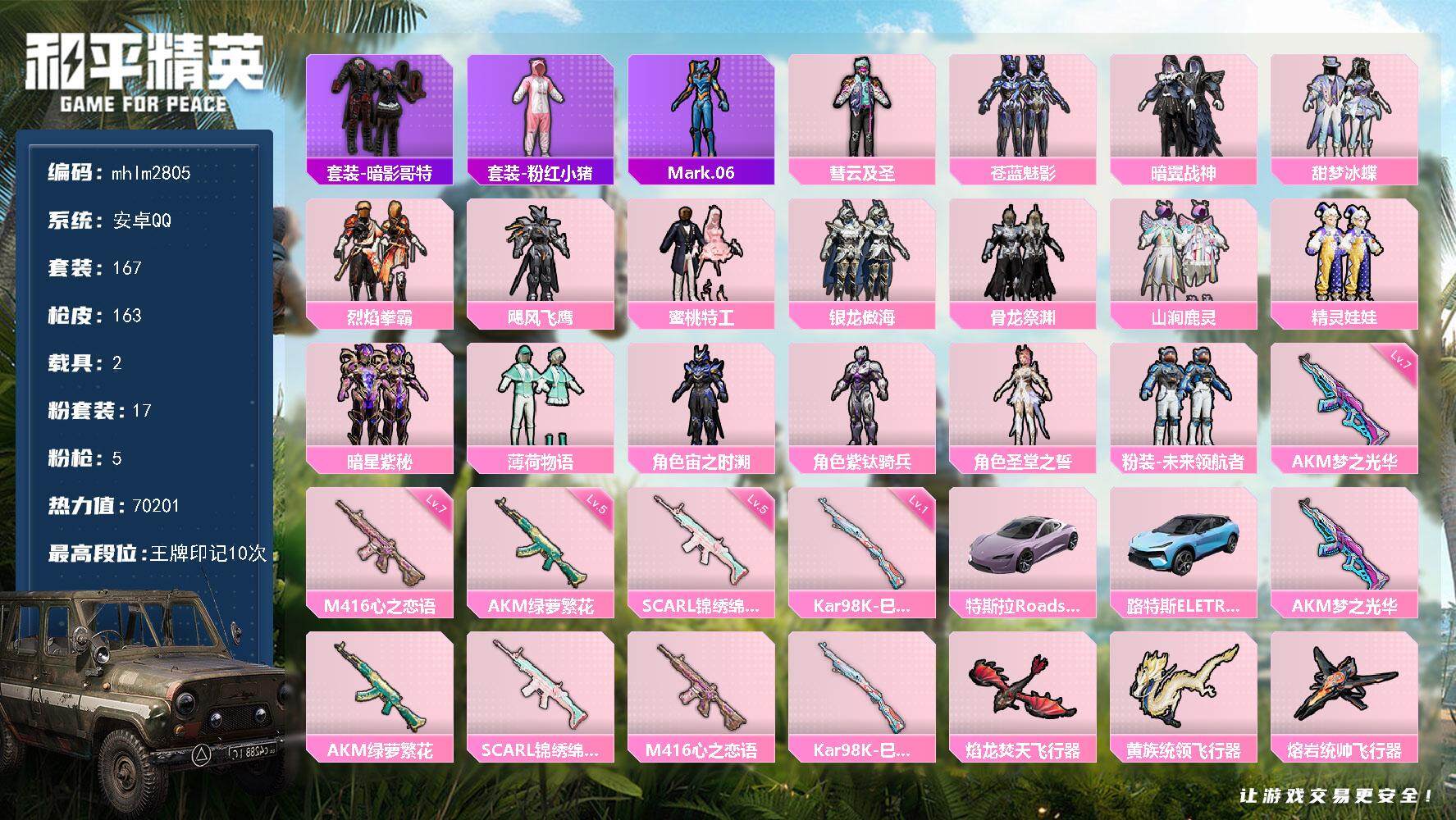 hs54844 安卓手Q-10王牌印记-9粉装-8特效枪-3载具-64702热力值-133套装-18