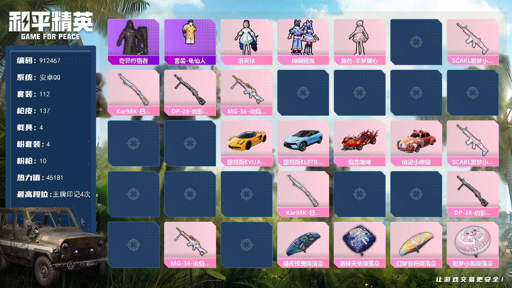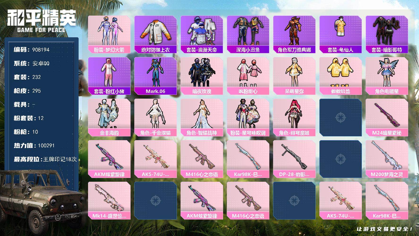 和平精英安卓QQ封号了,,不想要了,你们谁想要就买吧。粉色套装:粉色回忆,怪诞乔克,甜心巧克力,宝贝奶油派,天使彩虹糖,雪国幻梦,梦幻火箭,金风玉露,蝶舞迷情,缤纷油彩,放客神游,幻彩马卡龙,银刃赛罗,冰霜白皇,童趣迷兔,炙焰红王,林间仙鹿,彩虹鹿灵,山涧鹿灵,蜜桃特工,蝶舞蔷薇,暗夜玫瑰,酣梦娃娃,绚金瑰梦,橘柚倾心,海盐物语,暖熊萌萌,寒光使者,小可学妹,仲夏莫吉托,飒粉甜心,天星战神,圣堂之
