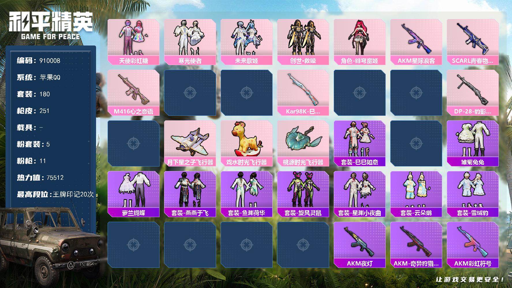 20王牌印记-5粉装-11特效枪-75512热力值-180套装-251枪皮-1卓越印记-1传奇印记