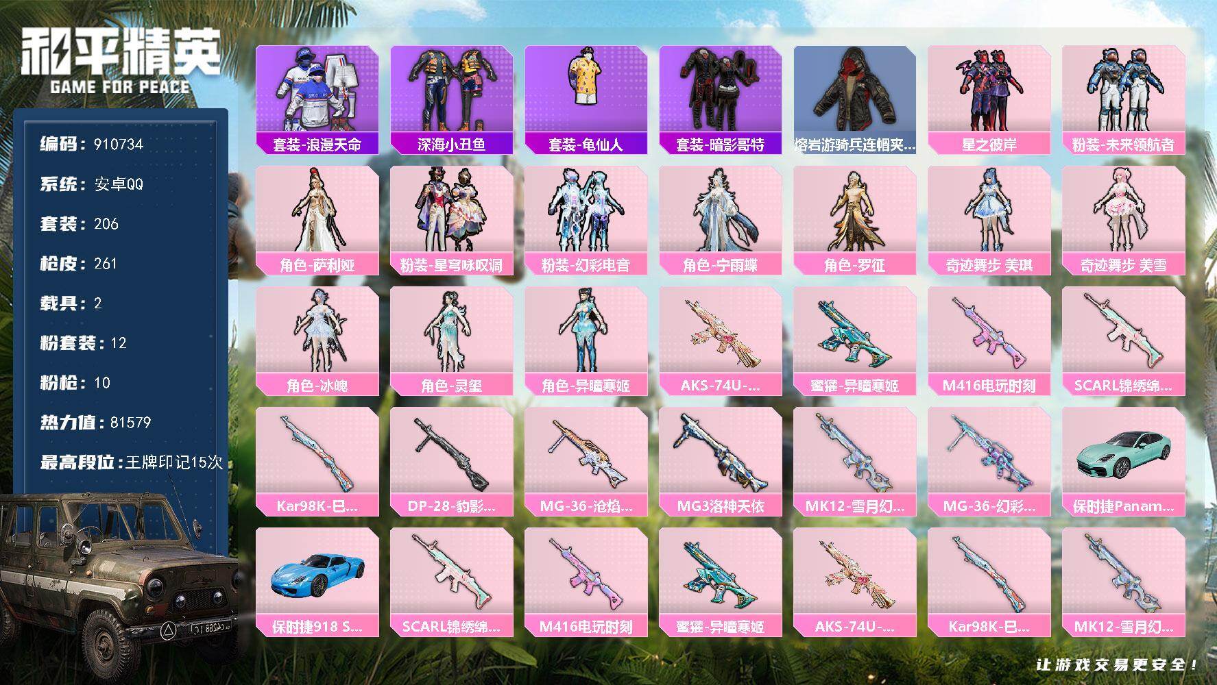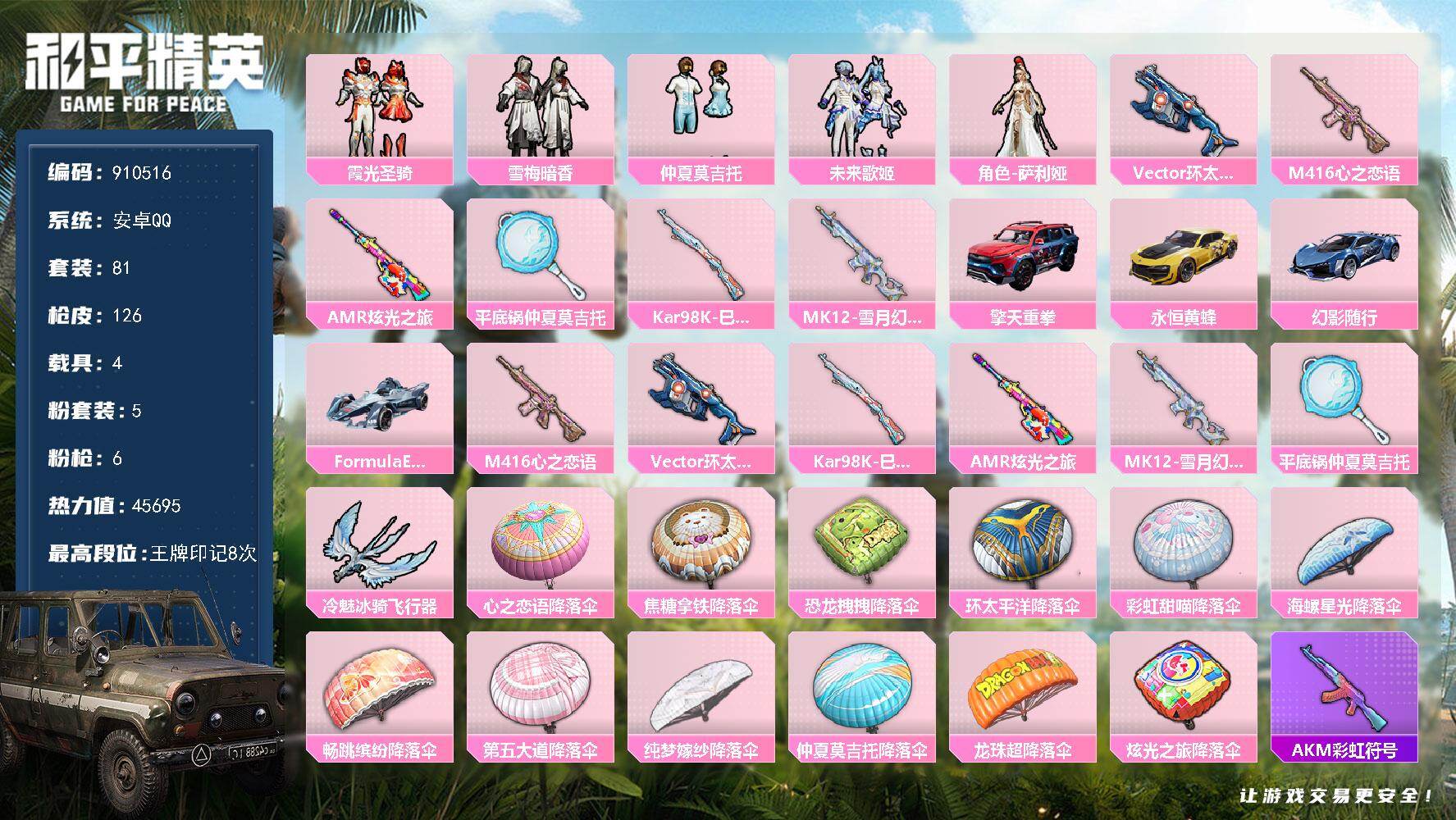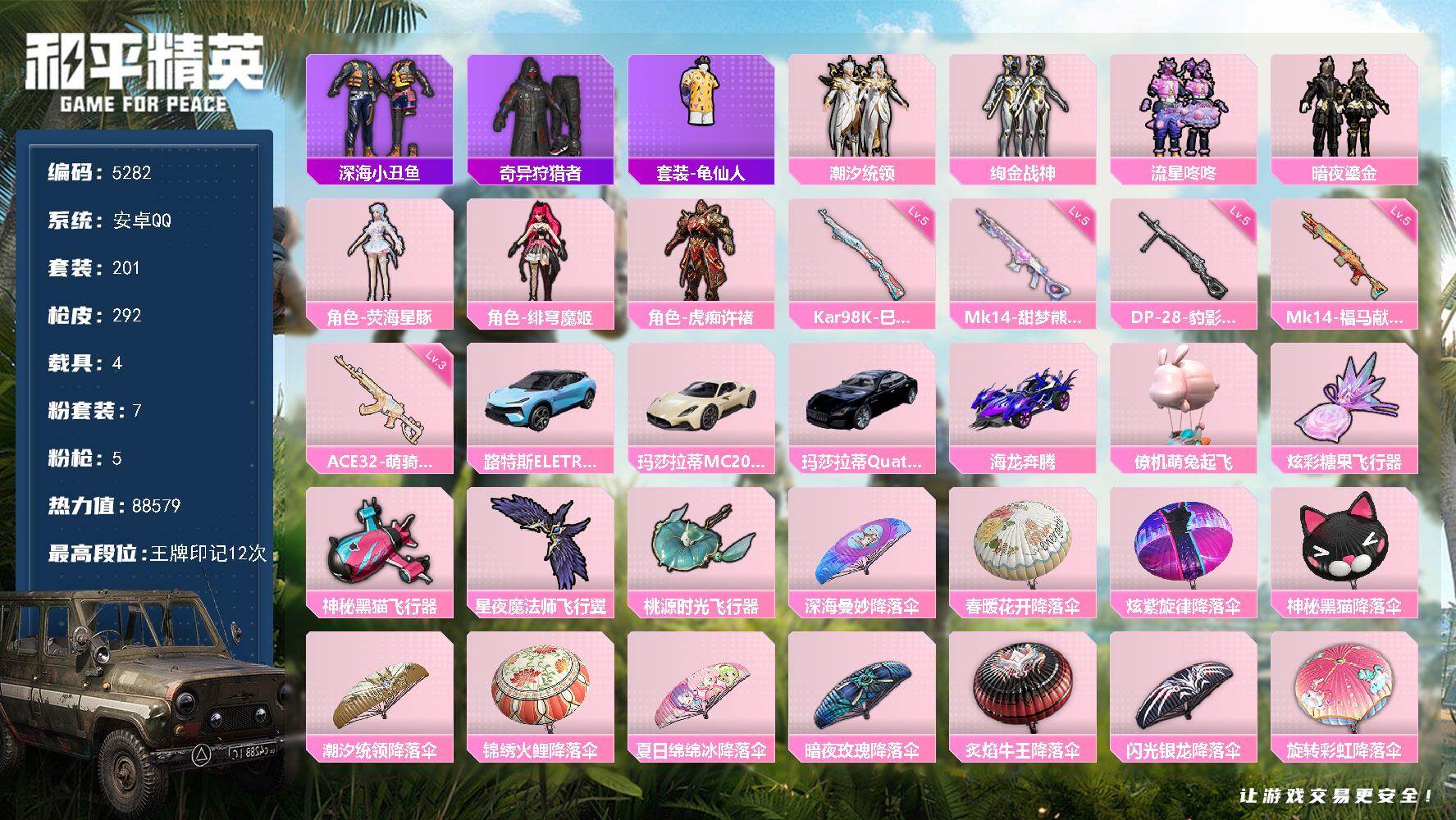 安卓 手Q-7粉装-5特效枪-4载具-4粉色飞行器-88579热力值-12王牌印