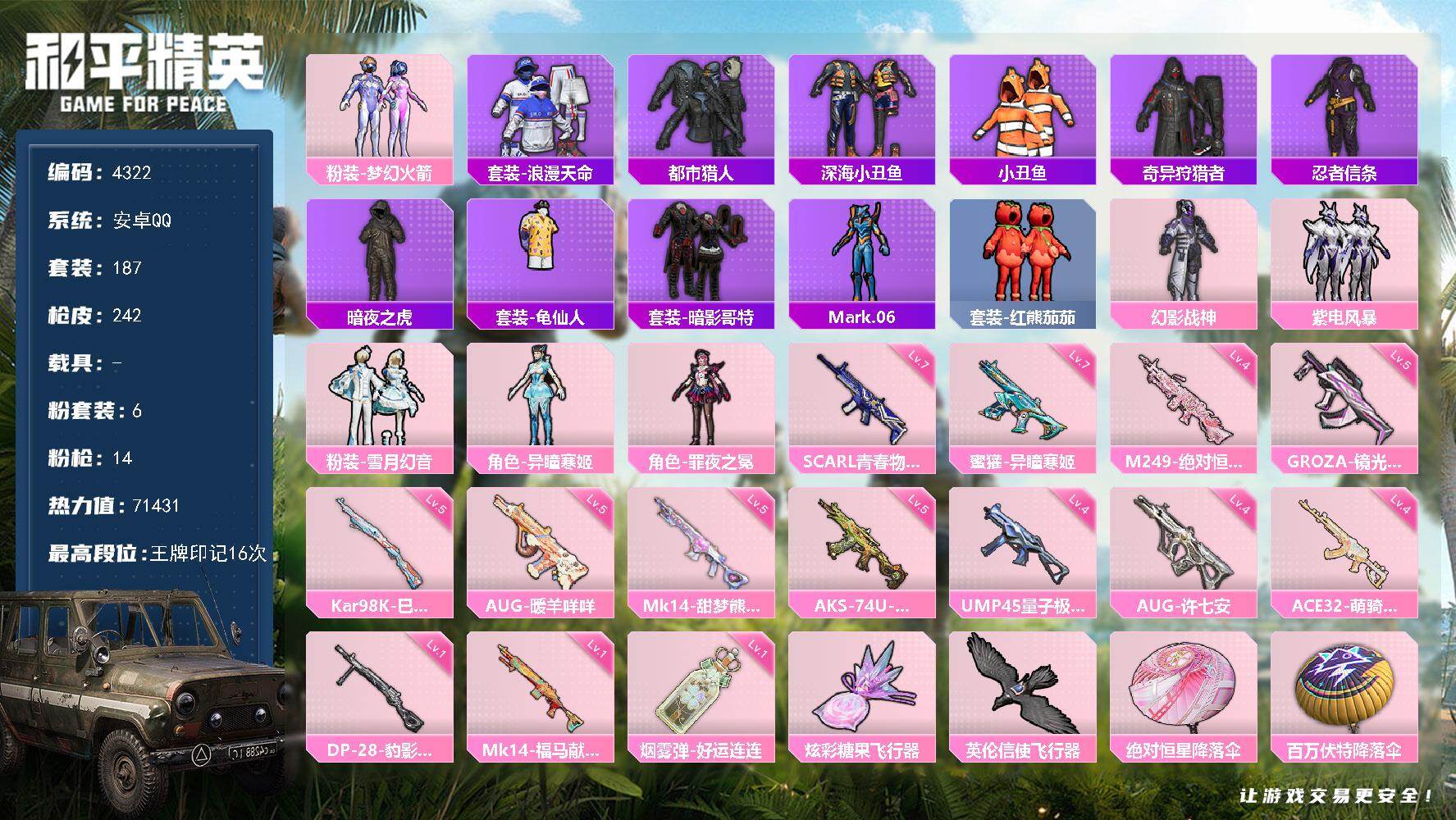 安卓 手Q-6粉装-14特效枪-0载具-2粉色飞行器-71431热力值-16王牌