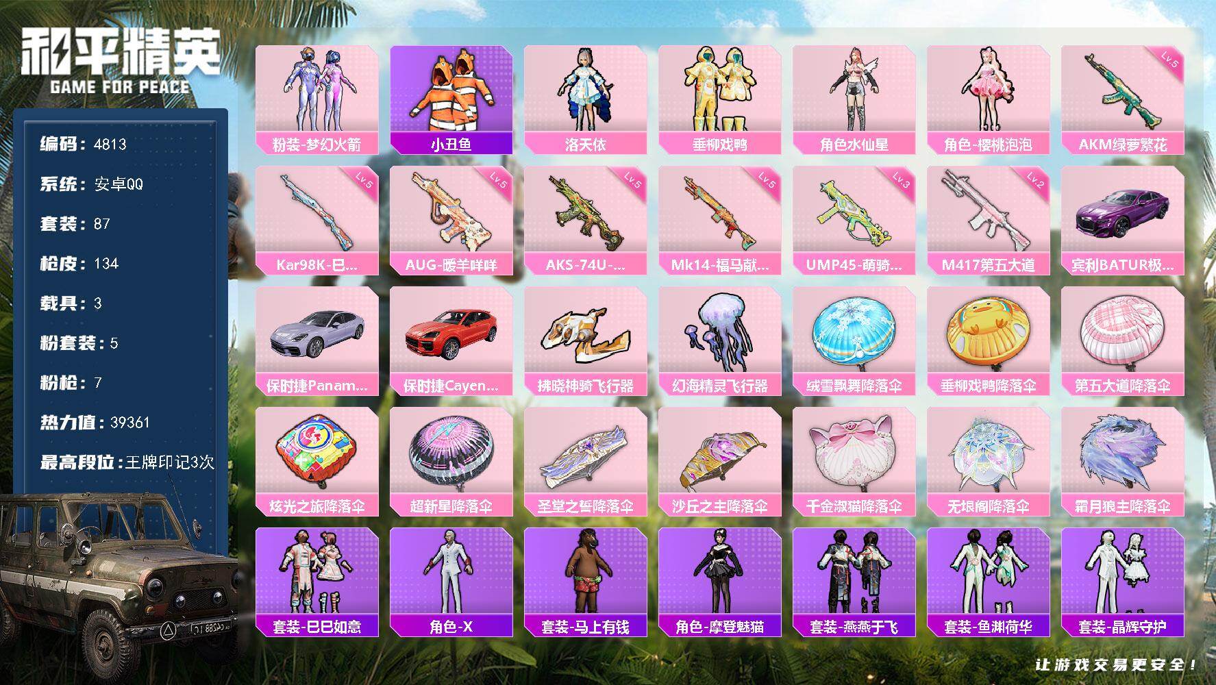 安卓 手Q-5粉装-7特效枪-3载具-2粉色飞行器-39361热力值-3王牌印记