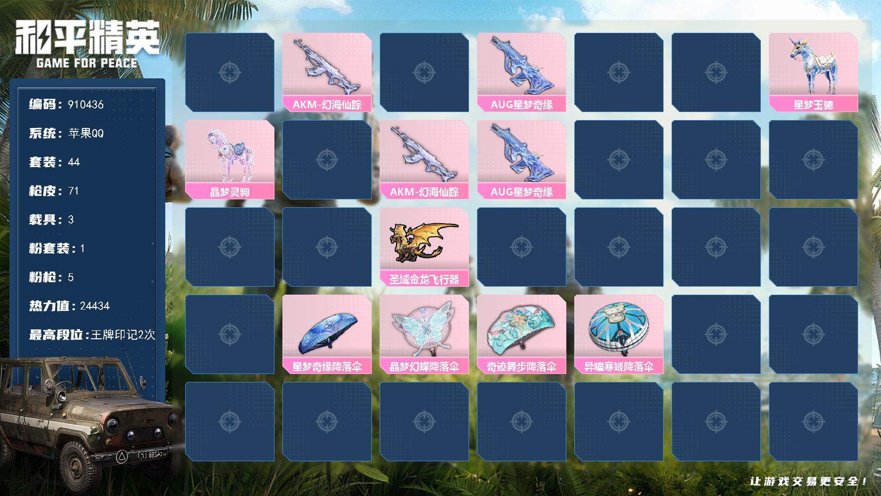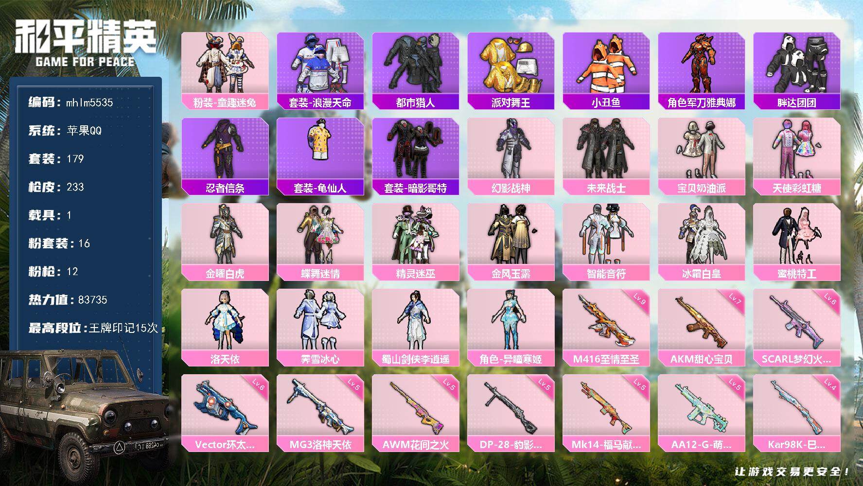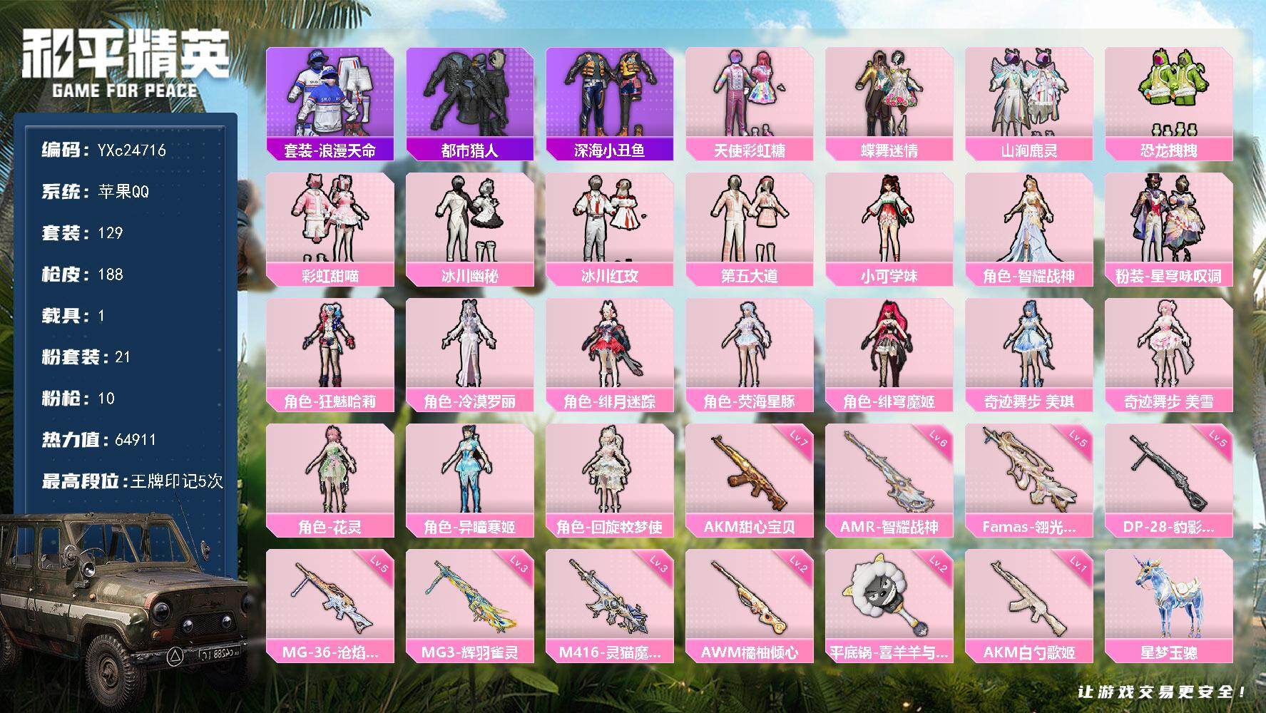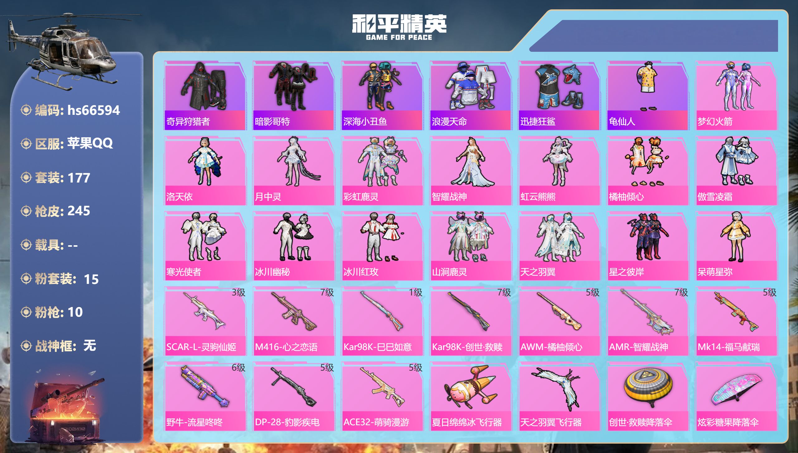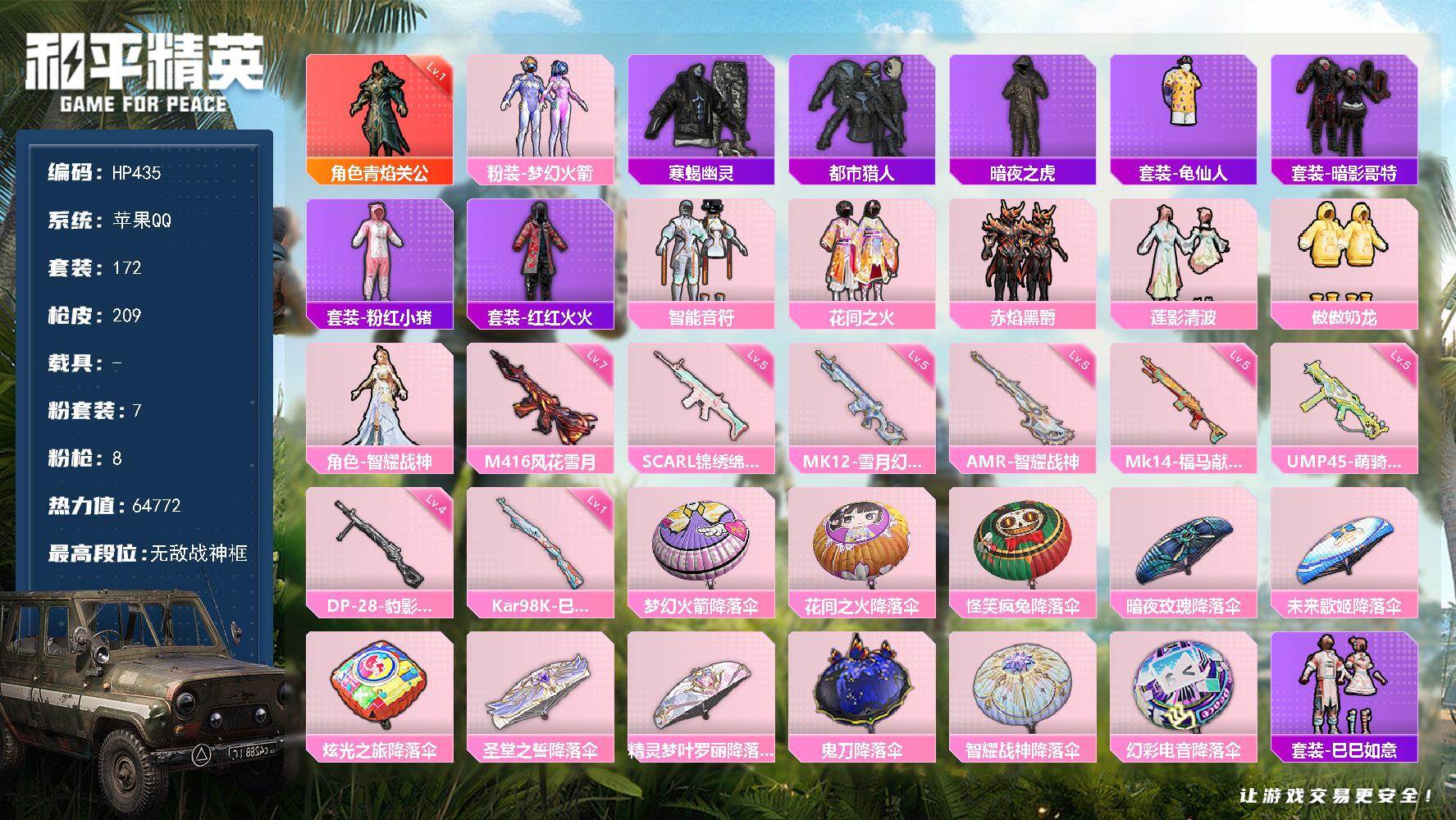 【秒换绑】苹果 手Q-无敌战神框-1神装-7粉装-8特效枪-0载具-0粉色飞行