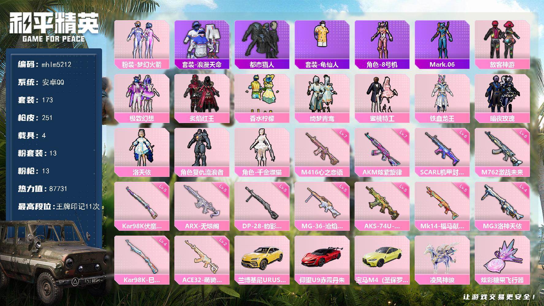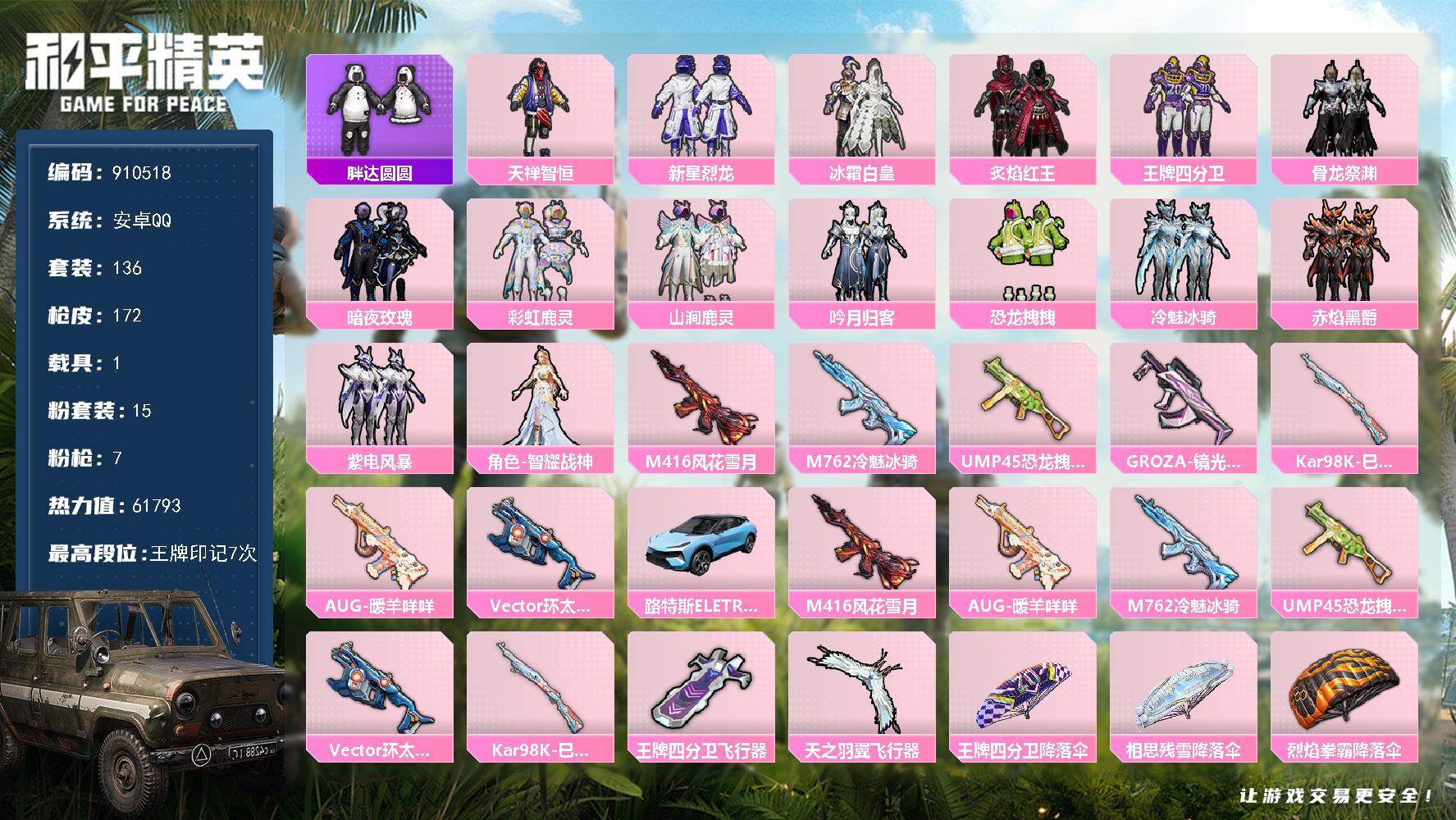 安卓 手Q-1神装-5粉装-7特效枪-2载具-4粉色飞行器-46578热力值-