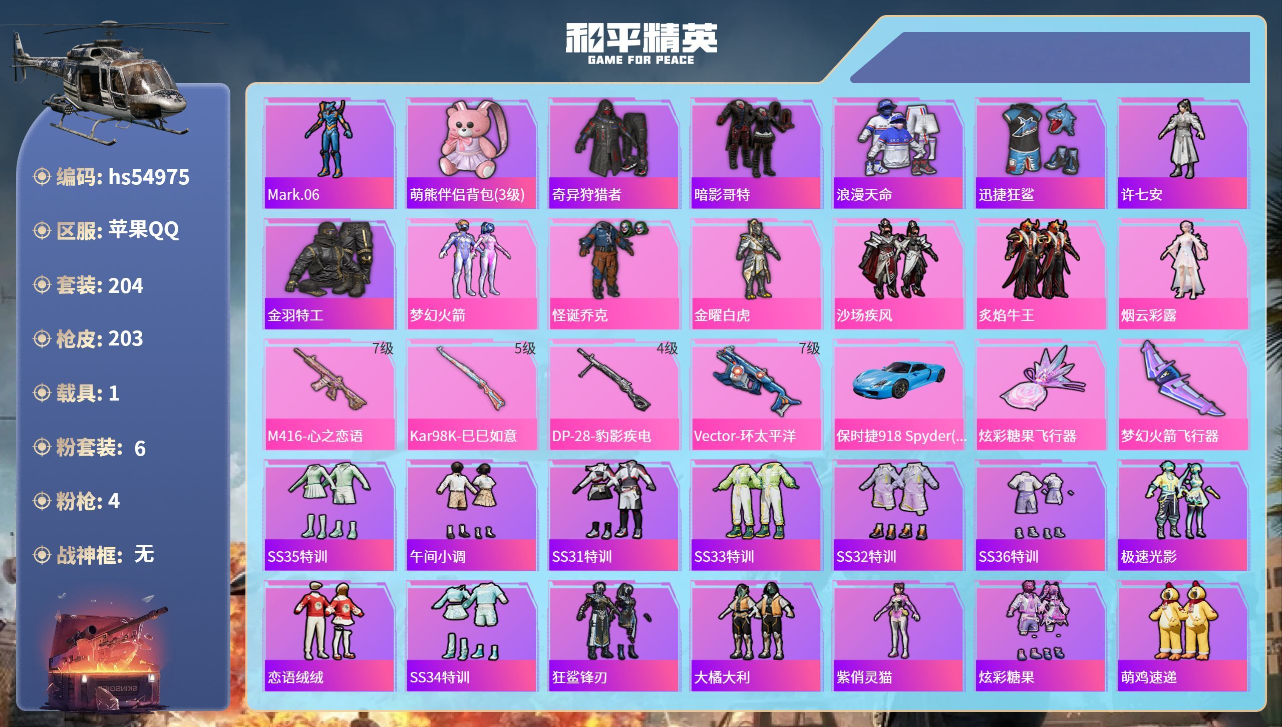 【817】【商品标题】:苹果 手Q-1神装-7粉装-6特效枪-5载具-4粉色飞