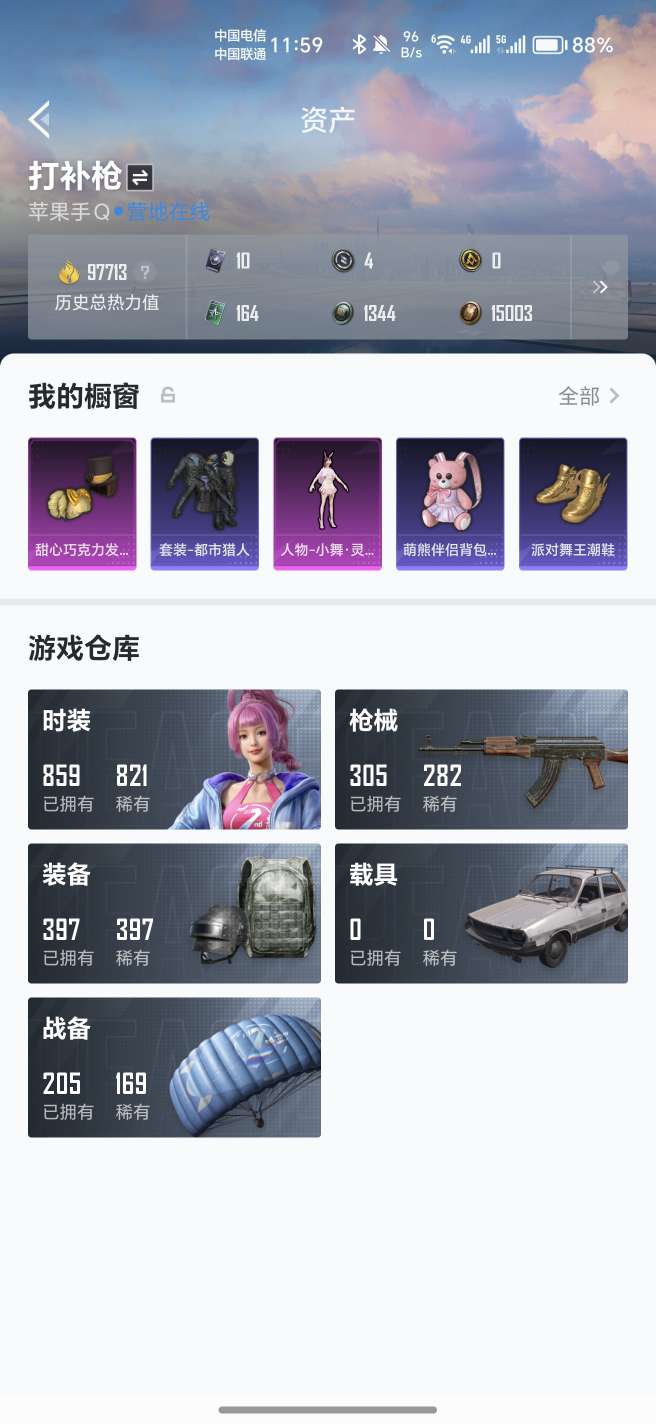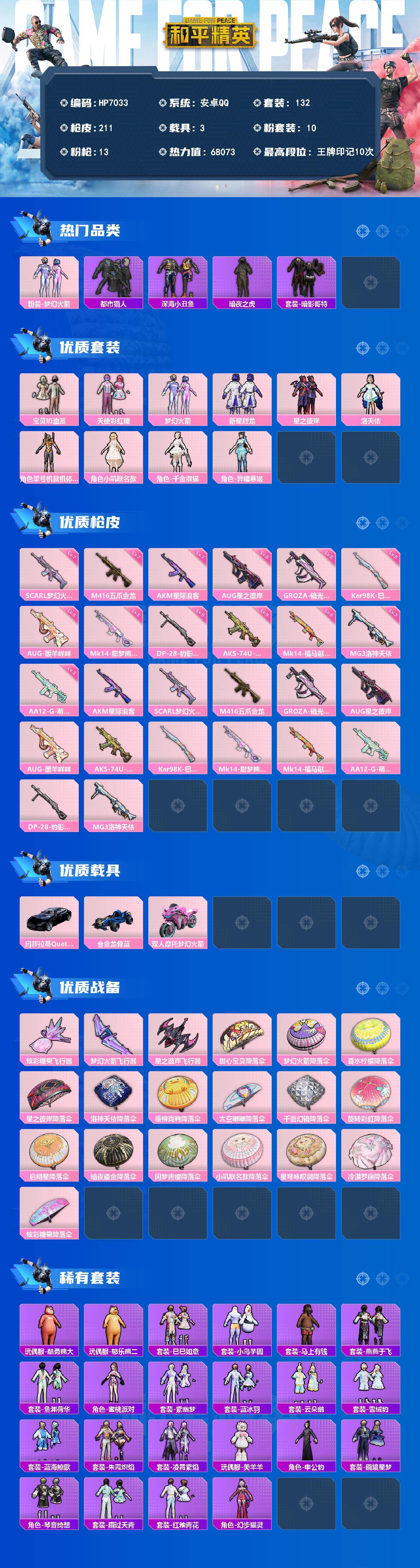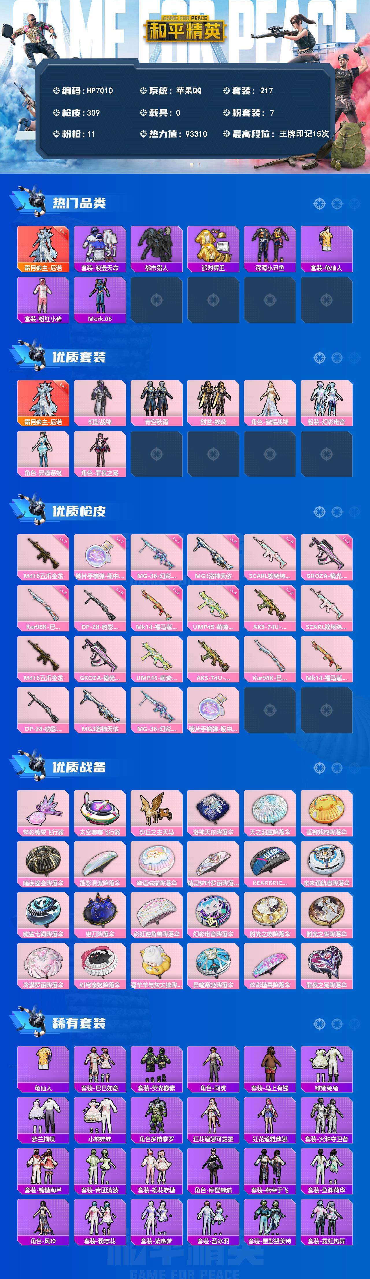 hs55894 苹果手Q-1王牌印记-15粉装-7特效枪-6载具-68511热力值-86套装-109