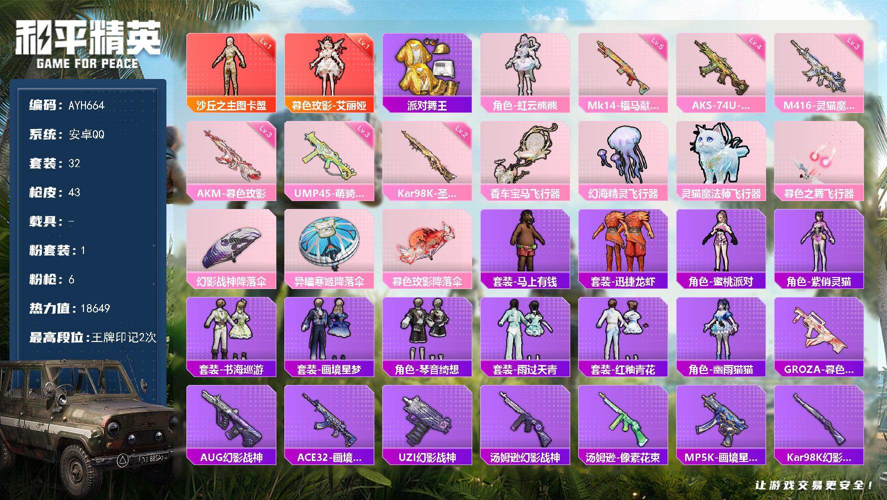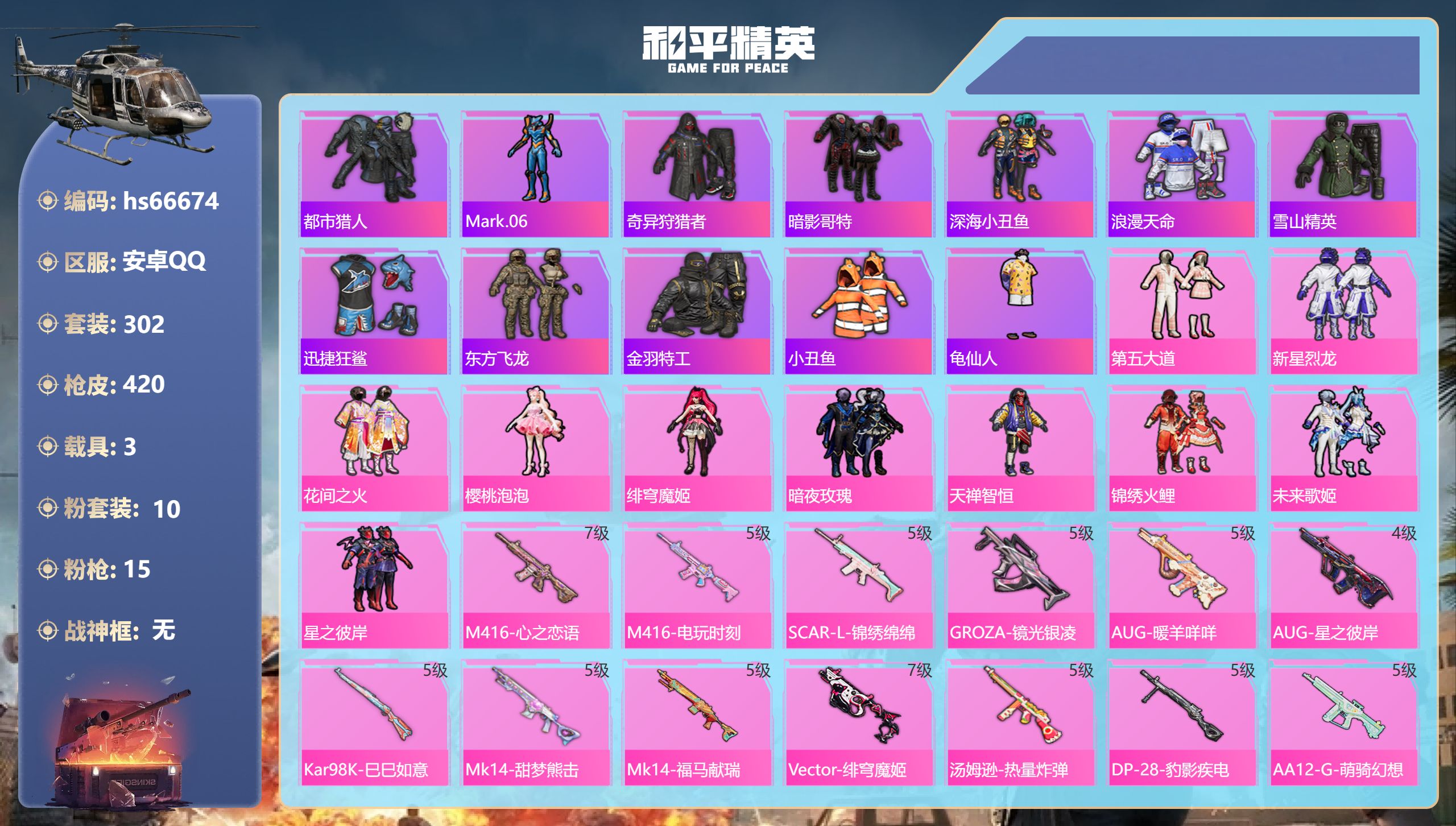 安卓 手Q-2神装-1粉装-6特效枪-0载具-5粉色飞行器-18649热力值-